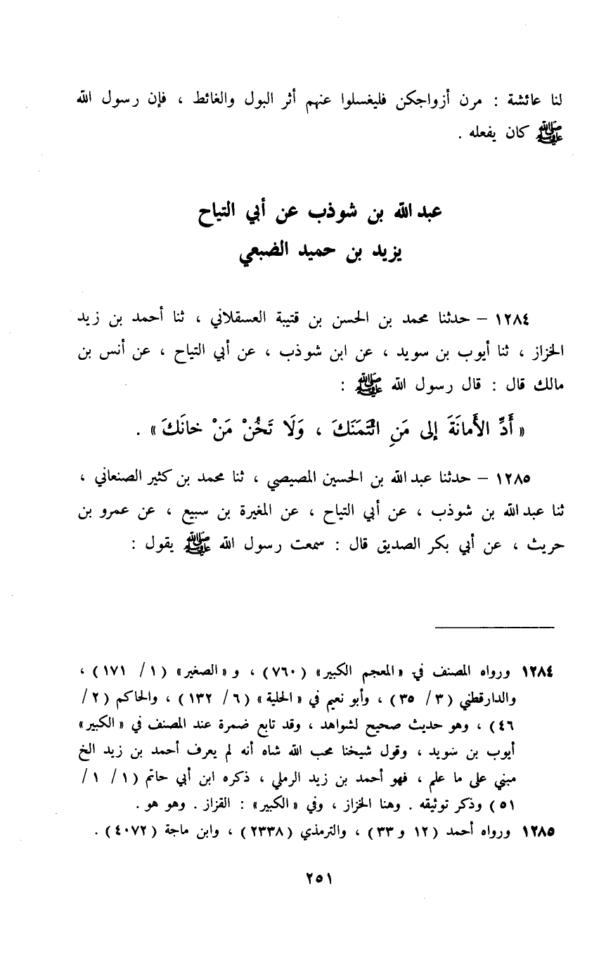 1284 - حَدَّثَنَا مُحَمَّدُ بْنُ الْحَسَنِ بْنِ قُتَيْبَةَ الْعَسْقَلَانِيُّ، ثَنَا أَحْمَدُ بْنُ زَيْدٍ الْخَزَّازُ، ثَنَا أَيُّوبُ بْنُ سُوَيْدٍ، عَنِ ابْنِ شَوْذَبٍ، عَنْ أَبِي التَّيَّاحِ، عَنْ أَنَسِ بْنِ مَالِكٍ، قَالَ: قَالَ رَسُولُ اللَّهِ صَلَّى اللهُ عَلَيْهِ وَسَلَّمَ: §«أَدِّ الْأَمَانَةَ إِلَى مَنِ ائْتَمَنَكَ , وَلَا تَخُنْ مَنْ خَانَكَ»
