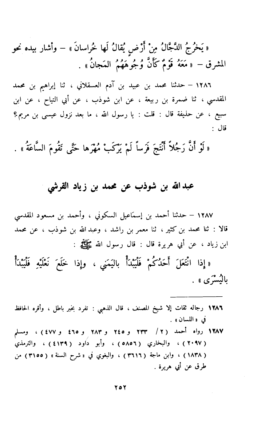 1287 - حَدَّثَنَا أَحْمَدُ بْنُ إِسْمَاعِيلَ السَّكُونِيُّ، وَأَحْمَدُ بْنُ مَسْعُودٍ الْمَقْدِسِيُّ، قَالَا: ثَنَا مُحَمَّدُ بْنُ كَثِيرٍ، ثَنَا مَعْمَرُ بْنُ رَاشِدٍ، وَعَبْدُ اللَّهِ بْنُ شَوْذَبٍ، عَنْ مُحَمَّدِ بْنِ زِيَادٍ، عَنْ أَبِي هُرَيْرَةَ، قَالَ: قَالَ رَسُولُ اللَّهِ صَلَّى اللهُ عَلَيْهِ وَسَلَّمَ: §«إِذَا انْتَعَلَ أَحَدُكُمْ فَلْيَبْدَأْ بِالْيُمْنَى , وَإِذَا خَلَعَ نَعْلَيْهِ فَلْيَبْدَأْ بِالْيُسْرَى»