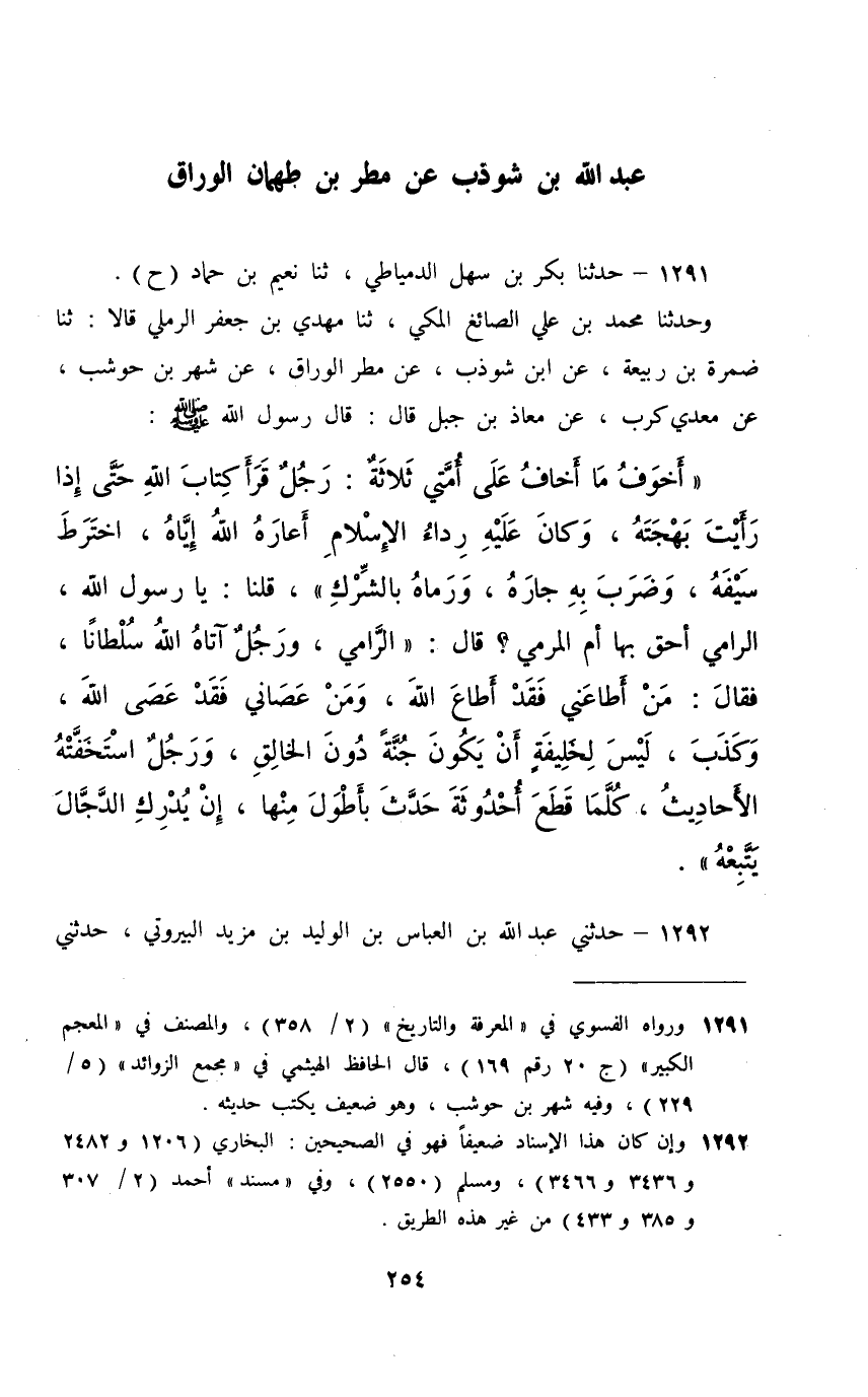 1291 - حَدَّثَنَا بَكْرُ بْنُ سَهْلٍ الدِّمْيَاطِيُّ، ثَنَا نُعَيْمُ بْنُ حَمَّادٍ، حَ وَحَدَّثَنَا مُحَمَّدُ بْنُ عَلِيٍّ الصَّائِغُ الْمَكِّيُّ، ثَنَا مَهْدِيُّ بْنُ جَعْفَرٍ الرَّمْلِيِّ، قَالَا: ثَنَا ضَمْرَةُ بْنُ رَبِيعَةَ، عَنِ ابْنِ شَوْذَبٍ، عَنْ مَطَرٍ الْوَرَّاقِ، عَنْ شَهْرِ بْنِ حَوْشَبٍ، عَنْ مَعْدِي كَرِبَ , عَنْ مُعَاذِ بْنِ جَبَلٍ، قَالَ: قَالَ رَسُولُ اللَّهِ صَلَّى اللهُ عَلَيْهِ وَسَلَّمَ: " §أَخْوَفُ مَا أَخَافُ عَلَى أُمَّتِي ثَلَاثَةٌ: رَجُلٌ قَرَأَ كِتَابَ اللَّهِ حَتَّى إِذَا رَأَيْتَ بَهْجَتَهُ , وَكَانَ عَلَيْهِ رِدَاءُ الْإِسْلَامِ أَعَارَهُ اللَّهُ إِيَّاهُ , اخْتَرَطَ سَيْفَهُ وَضَرَبَ بِهِ جَارَهُ , وَرَمَاهُ بِالشِّرْكِ " , قُلْنَا: يَا رَسُولَ اللَّهِ الرَّامِي أَحَقُّ بِهَا أَمِ الْمَرْمِيُّ؟ قَالَ: " الرَّامِي , وَرَجُلٌ آتَاهُ اللَّهُ سُلْطَانًا , فَقَالَ: مَنْ أَطَاعَنِي فَقَدْ أَطَاعَ اللَّهَ , وَمَنْ عَصَانِي فَقَدْ عَصَى اللَّهَ , وَكَذَّبَ , لَيْسَ لِخَلِيفَةٍ أَنْ يَكُونَ جُنَّةً دُونَ الْخَالِقِ , وَرَجُلٌ اسْتَخَفَّتْهُ الْأَحَادِيثُ , كُلَّمَا قَطَعَ أُحْدُوثَةً حَدَّثَ بِأَطْوَلَ مِنْهَا إِنْ يُدْرِكِ الدَّجَّالَ يَتْبَعُهُ "