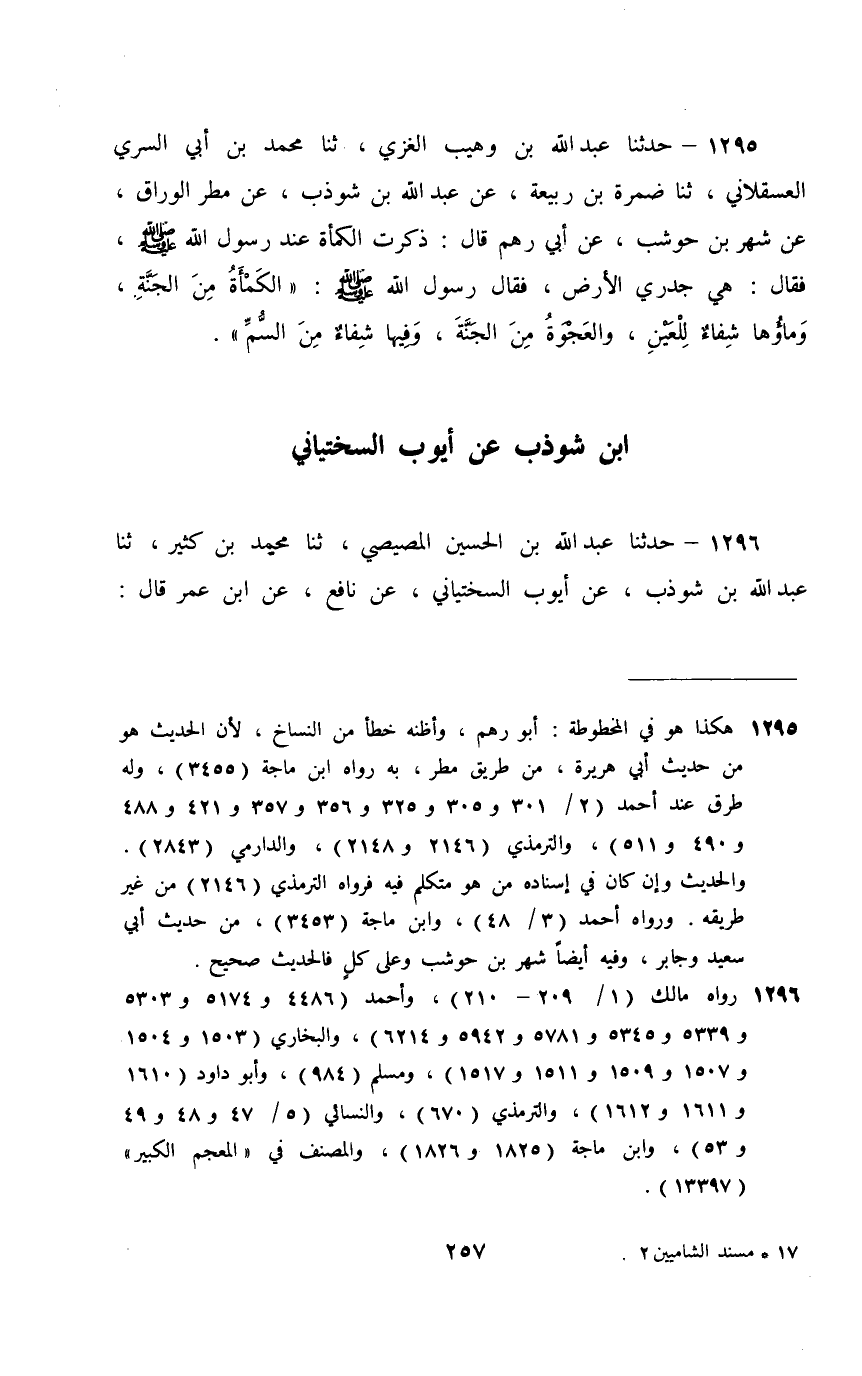 1295 - حَدَّثَنَا عَبْدُ اللَّهِ بْنُ وُهَيْبٍ الْغَزِّيُّ، ثَنَا مُحَمَّدُ بْنُ أَبِي السَّرِيِّ الْعَسْقَلَانِيُّ، ثَنَا ضَمْرَةُ بْنُ رَبِيعَةَ، عَنْ عَبْدِ اللَّهِ بْنِ شَوْذَبٍ، عَنْ مَطَرٍ الْوَرَّاقِ، عَنْ شَهْرِ بْنِ حَوْشَبٍ، عَنْ أَبِي رُهْمٍ، قَالَ: ذُكِرَتِ الْكَمْأَةُ عِنْدَ رَسُولِ اللَّهِ صَلَّى اللهُ عَلَيْهِ وَسَلَّمَ , فَقَالَ: هِيَ جُدَرِيُّ الْأَرْضِ , فَقَالَ رَسُولُ اللَّهِ صَلَّى اللهُ عَلَيْهِ وَسَلَّمَ: §«الْكَمْأَةُ مِنَ الْجَنَّةِ , وَمَاؤُهَا شِفَاءٌ لِلْعَيْنِ , وَالْعَجْوَةُ مِنَ الْجَنَّةِ , وَفِيهَا شِفَاءٌ مِنَ السُّمِّ»