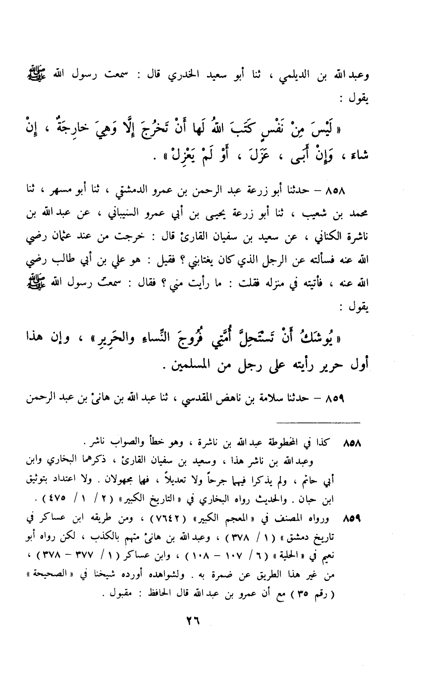 858 - حَدَّثَنَا أَبُو زُرْعَةَ عَبْدُ الرَّحْمَنِ بْنُ عَمْرٍو الدِّمَشْقِيُّ، ثَنَا أَبُو مُسْهِرٍ، ثَنَا مُحَمَّدُ بْنُ شُعَيْبٍ، ثَنَا أَبُو زُرْعَةَ يَحْيَى بْنُ أَبِي عَمْرٍو السَّيْبَانِيُّ , عَنْ عَبْدِ اللَّهِ بْنِ نَاشِرَةَ الْكِنَانِيِّ، عَنْ سَعِيدِ بْنِ سُفْيَانَ الْقَارِئِ، قَالَ: خَرَجْتُ مِنْ عِنْدِ عُثْمَانَ رَضِيَ اللَّهُ عَنْهُ فَسَأَلْتُهُ , عَنِ الرَّجُلِ الَّذِي كَانَ يَغْتَابُنِي؟ فَقِيلَ هُوَ عَلِيُّ بْنُ أَبِي طَالِبٍ رَضِيَ اللَّهُ عَنْهُ , فَأَتَيْتُهُ فِي مَنْزِلِهِ فَقُلْتُ مَا رَأَيْتَ مِنِّي؟ فَقَالَ: سَمِعْتُ رَسُولَ اللَّهِ صَلَّى اللهُ عَلَيْهِ وَسَلَّمَ يَقُولُ: §«يُوشِكُ أَنْ تَسْتَحِلَّ أُمَّتِي فُرُوجَ النِّسَاءِ وَالْحَرِيرِ» وَإِنَّ هَذَا أَوَّلُ حَرِيرٍ رَأَيْتُهُ عَلَى رَجُلٍ مِنَ الْمُسْلِمِينَ