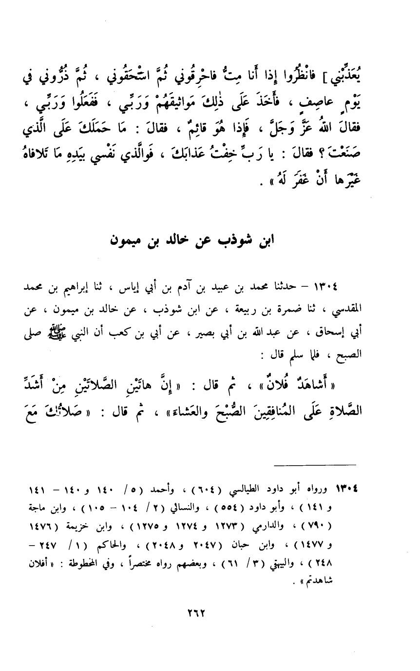 1304 - حَدَّثَنَا مُحَمَّدُ بْنُ عُبَيْدِ بْنِ آدَمَ بْنِ أَبِي إِيَاسَ، ثَنَا إِبْرَاهِيمُ بْنُ مُحَمَّدٍ الْمَقْدِسِيُّ، ثَنَا ضَمْرَةُ بْنُ رَبِيعَةَ، عَنِ ابْنِ شَوْذَبٍ، عَنْ خَالِدِ بْنِ مَيْمُونٍ، عَنْ أَبِي إِسْحَاقَ، عَنْ عَبْدِ اللَّهِ بْنِ أَبِي بَصِيرٍ، عَنْ أُبَيِّ بْنِ كَعْبٍ، أَنَّ النَّبِيَّ صَلَّى اللهُ عَلَيْهِ وَسَلَّمَ صَلَّى الصُّبْحَ، فَلَمَّا سَلَّمَ قَالَ: «أَشَاهِدٌ فُلَانٌ» , ثُمَّ قَالَ: «إِنَّ §هَاتَيْنِ الصَّلَاتَيْنِ مِنْ أَشَدِّ الصَّلَاةِ عَلَى الْمُنَافِقِينَ , الصُّبْحَ وَالْعِشَاءَ» , ثُمَّ قَالَ: «صَلَاتُكَ مَعَ الرَّجُلِ أَزْكَى مِنْ صَلَاتِكَ وَحْدَكَ , وَصَلَاتُكَ مَعَ الرَّجُلَيْنِ أَزْكَى مِنْ صَلَاتِكَ مَعَ الرَّجُلِ , وَمَا زَادَ فَهُوَ أَحَبُّ إِلَى اللَّهِ عَزَّ وَجَلَّ»