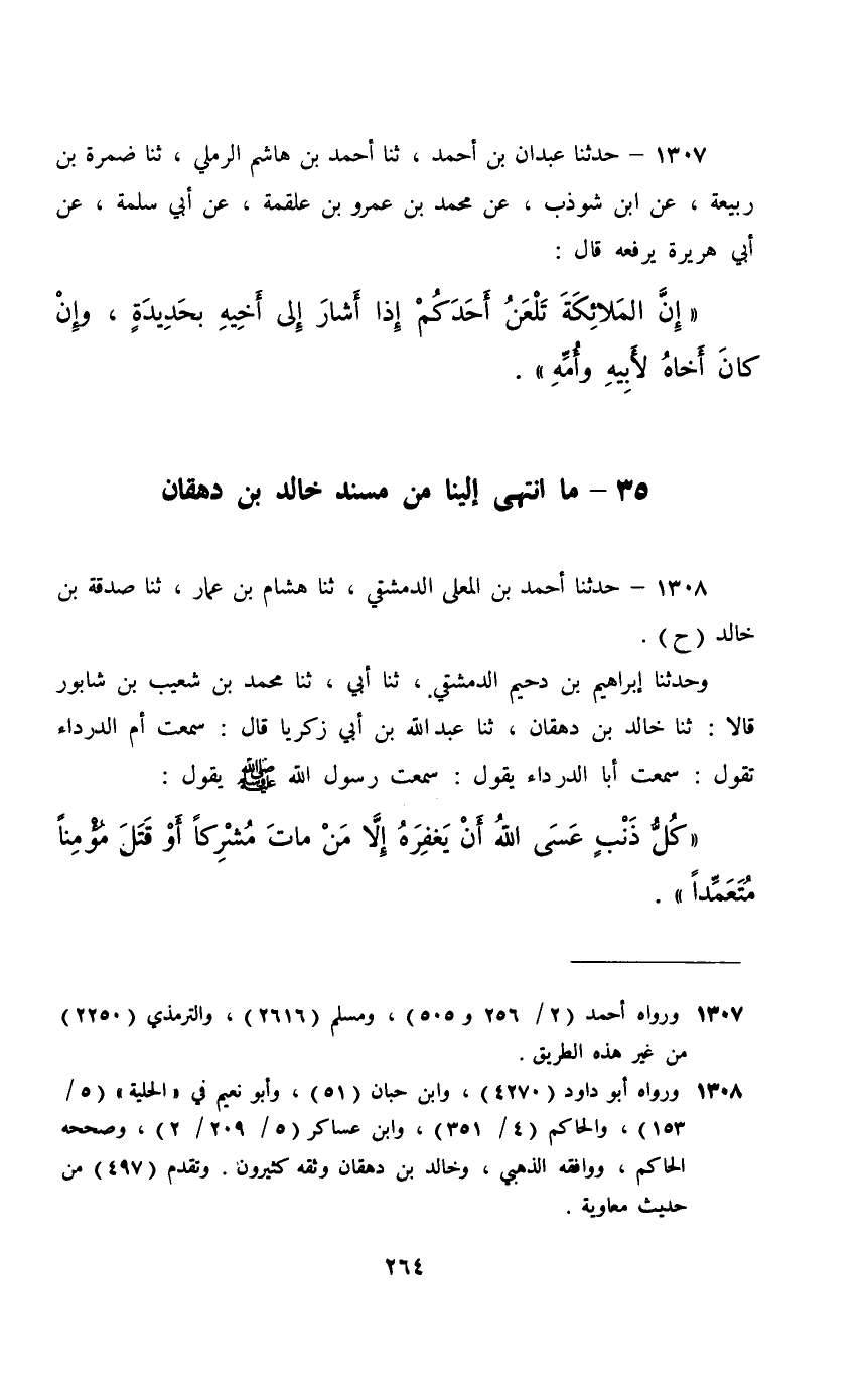 1308 - حَدَّثَنَا أَحْمَدُ بْنُ الْمُعَلَّى الدِّمَشْقِيُّ، ثَنَا هِشَامُ بْنُ عَمَّارٍ، ثَنَا صَدَقَةُ بْنُ خَالِدٍ، حَ وَحَدَّثَنَا إِبْرَاهِيمُ بْنُ دُحَيْمٍ الدِّمَشْقِيُّ، ثَنَا أَبِي، ثَنَا مُحَمَّدُ بْنُ شُعَيْبِ بْنِ شَابُورَ، قَالَا: ثَنَا خَالِدُ بْنُ دِهْقَانٍ، ثَنَا عَبْدُ اللَّهِ بْنُ أَبِي زَكَرِيَّا، قَالَ: سَمِعْتُ أُمَّ الدَّرْدَاءِ، تَقُولُ: سَمِعْتُ أَبَا الدَّرْدَاءِ، يَقُولُ: سَمِعْتُ رَسُولَ اللَّهِ صَلَّى اللهُ عَلَيْهِ وَسَلَّمَ يَقُولُ: §«كُلُّ ذَنْبٍ عَسَى اللَّهُ أَنْ يَغْفِرَهُ , إِلَّا مَنْ مَاتَ مُشْرِكًا , أَوْ قَتَلَ مُؤْمِنًا مُتَعَمِّدًا»
