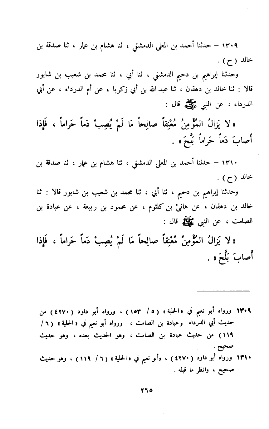 1309 - حَدَّثَنَا أَحْمَدُ بْنُ الْمُعَلَّى الدِّمَشْقِيُّ، ثَنَا هِشَامُ بْنُ عَمَّارٍ، ثَنَا صَدَقَةُ بْنُ خَالِدٍ، حَ وَحَدَّثَنَا إِبْرَاهِيمُ بْنُ دُحَيْمٍ الدِّمَشْقِيُّ، ثَنَا أَبِي، ثَنَا مُحَمَّدُ بْنُ شُعَيْبِ بْنِ شَابُورَ، قَالَا: ثَنَا خَالِدُ بْنُ دِهْقَانٍ، ثَنَا عَبْدُ اللَّهِ بْنُ أَبِي زَكَرِيَّا، عَنْ أُمِّ الدَّرْدَاءِ، عَنْ أَبِي الدَّرْدَاءِ، عَنِ النَّبِيِّ صَلَّى اللهُ عَلَيْهِ وَسَلَّمَ قَالَ: §«لَا يَزَالُ الْمُؤْمِنُ مُعْنِقًا صَالِحًا مَا لَمْ يُصِبْ دَمًا حَرَامًا , فَإِذَا أَصَابَ دَمًا حَرَامًا بَلَّحَ»