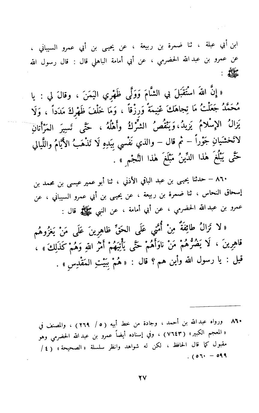 860 - حَدَّثَنَا يَحْيَى بْنُ عَبْدِ الْبَاقِي الْأَذَنِيُّ، ثَنَا أَبُو عُمَيْرٍ عِيسَى بْنُ مُحَمَّدِ بْنِ إِسْحَاقَ النَّحَّاسُ , ثَنَا ضَمْرَةُ بْنُ رَبِيعَةَ، عَنْ يَحْيَى بْنِ أَبِي عَمْرٍو السَّيْبَانِيِّ، عَنْ عَمْرِو بْنِ عَبْدِ اللَّهِ الْحَضْرَمِيِّ، عَنْ أَبِي أُمَامَةَ، عَنِ النَّبِيِّ صَلَّى اللهُ عَلَيْهِ وَسَلَّمَ قَالَ: §«لَا تَزَالُ طَائِفَةٌ مِنْ أُمَّتِي عَلَى الْحَقِّ ظَاهِرِينَ عَلَى مَنْ يَغْزُوهُمْ , قَاهِرِينَ لَا يَضُرُّهُمْ مَنْ نَاوَأَهُمْ حَتَّى يَأْتِيَهُمْ أَمْرُ اللَّهِ وَهُمْ كَذَلِكَ» قِيلَ: يَا رَسُولَ اللَّهِ وَأَيْنَ هُمْ؟ قَالَ: «هُمْ بِبَيْتِ الْمَقْدِسِ»