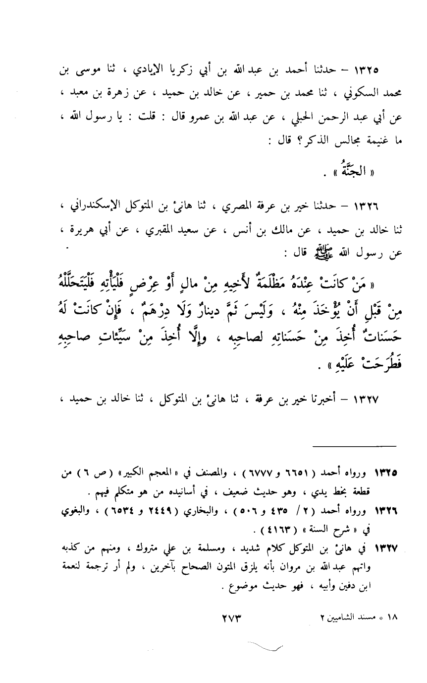1326 - حَدَّثَنَا خَيْرُ بْنُ عَرَفَةَ الْمِصْرِيُّ، ثَنَا هَانِئُ بْنُ الْمُتَوَكِّلِ الْإِسْكَنْدَرَانِيُّ، ثَنَا خَالِدُ بْنُ حُمَيْدٍ، عَنْ مَالِكِ بْنِ أَنَسٍ، عَنْ سَعِيدٍ الْمَقْبُرِيِّ، عَنْ أَبِي هُرَيْرَةَ، عَنْ رَسُولِ اللَّهِ صَلَّى اللهُ عَلَيْهِ وَسَلَّمَ قَالَ: §«مَنْ كَانَتْ عِنْدَهُ مَظْلَمَةٌ لِأَخِيهِ مِنْ مَالٍ أَوْ عِرْضٍ , فَلْيَأْتِهِ , فَلْيَتَحَلَّلْهُ مِنْ قَبْلِ أَنْ يُؤْخَذَ مِنْهُ , وَلَيْسَ ثَمَّ دِينَارٌ وَلَا دِرْهَمٌ , فَإِنْ كَانَتْ لَهُ حَسَنَاتٌ أُخِذَ مِنْ حَسَنَاتِهِ لِصَاحِبِهِ , وَإِلَّا أُخِذَ مِنْ سَيِّئَاتِ صَاحِبِهِ فَطُرِحَتْ عَلَيْهِ»