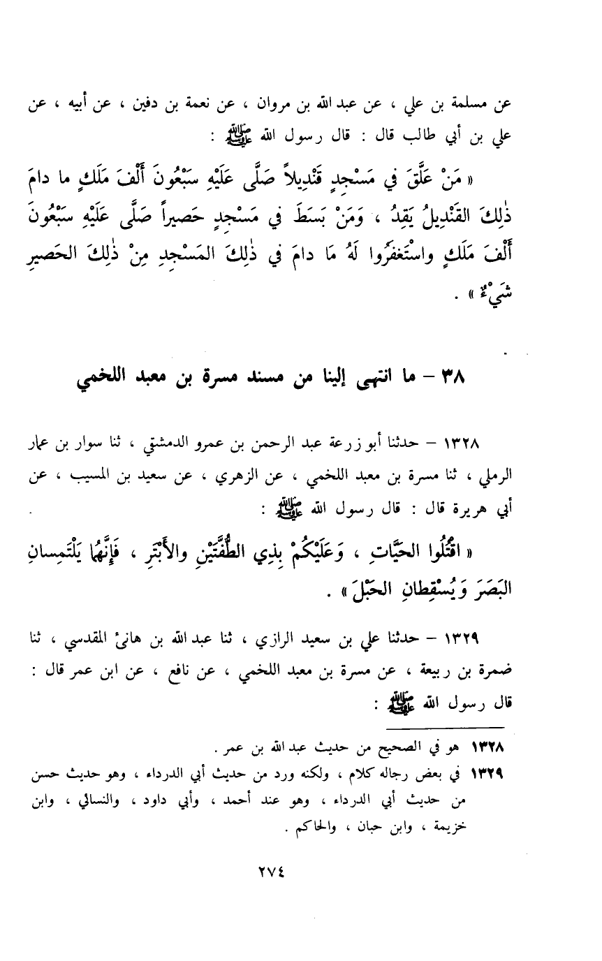1328 - حَدَّثَنَا أَبُو زُرْعَةَ عَبْدُ الرَّحْمَنِ بْنُ عَمْرٍو الدِّمَشْقِيُّ، ثَنَا سَوَّارُ بْنُ عَمَّارٍ الرَّمْلِيُّ، ثَنَا مَسَرَّةُ بْنُ مَعْبَدٍ اللَّخْمِيُّ، عَنِ الزُّهْرِيِّ، عَنْ سَعِيدِ بْنِ الْمُسَيِّبِ، عَنْ أَبِي هُرَيْرَةَ، قَالَ: قَالَ رَسُولُ اللَّهِ صَلَّى اللهُ عَلَيْهِ وَسَلَّمَ: §«اقْتُلُوا الْحَيَّاتِ , وَعَلَيْكُمْ بِذِي الطُّفَّتَيْنِ وَالْأَبْتَرِ فَإِنَّهُمَا يَلْتَمِسَانِ الْبَصَرَ وَيُسْقِطَانِ الْحَبْلَ»