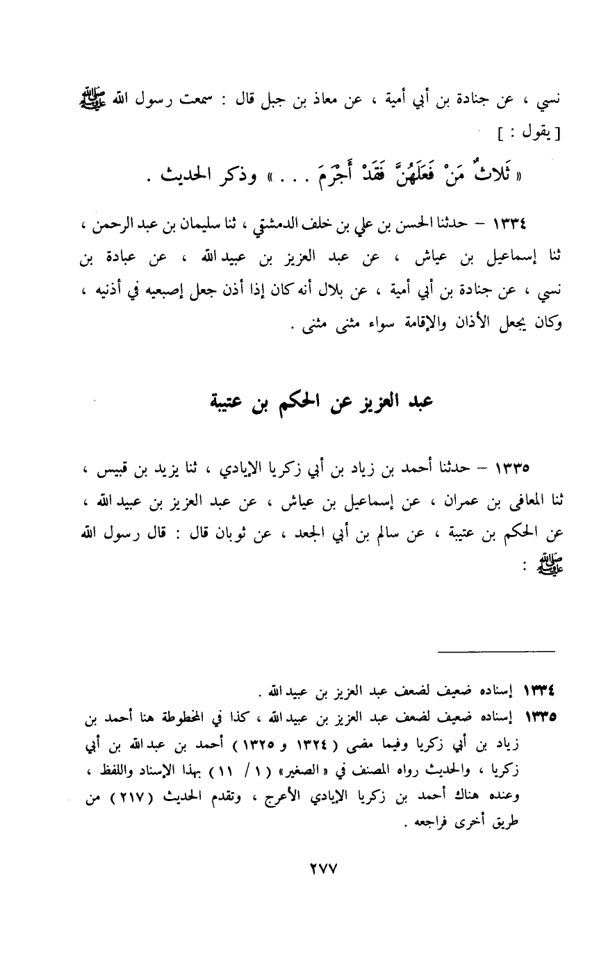 1335 - حَدَّثَنَا أَحْمَدُ بْنُ زِيَادِ بْنِ أَبِي زَكَرِيَّا الْإِيَادِيُّ، ثَنَا يَزِيدُ بْنُ قُبَيْسِ، ثَنَا الْمُعَافَى بْنُ عِمْرَانَ، عَنْ إِسْمَاعِيلَ بْنِ عَيَّاشٍ، عَنْ عَبْدِ الْعَزِيزِ بْنِ عُبَيْدِ اللَّهِ، عَنِ الْحَكَمِ بْنِ عُتَيْبَةَ، عَنْ سَالِمِ بْنِ أَبِي الْجَعْدِ، عَنْ ثَوْبَانَ، قَالَ: قَالَ رَسُولُ اللَّهِ صَلَّى اللهُ عَلَيْهِ وَسَلَّمَ: §«اسْتَقِيمُوا وَلَنْ تُحْصُوا , وَخَيْرُ أَعْمَالِكُمُ الصَّلَاةُ , وَلَا يُحَافِظُ عَلَى الْوُضُوءِ إِلَّا مُؤْمِنٌ»