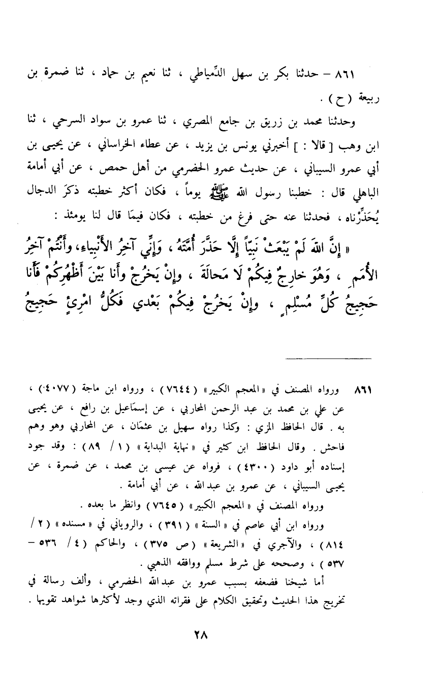 861 - حَدَّثَنَا بَكْرُ بْنُ سَهْلٍ الدِّمْيَاطِيُّ، ثَنَا نُعَيْمُ بْنُ حَمَّادٍ، ثَنَا ضَمْرَةُ بْنُ رَبِيعَةَ، حَ وَحَدَّثَنَا مُحَمَّدُ بْنُ رُزَيْقِ بْنِ جَامِعٍ الْمِصْرِيُّ، ثَنَا عَمْرُو بْنُ سَوَّادٍ السَّرْحِيُّ، ثَنَا ابْنُ وَهْبٍ، [قَالَا] أَخْبَرَنِي يُونُسُ بْنُ يَزِيدَ، عَنْ عَطَاءٍ الْخُرَاسَانِيِّ، عَنْ يَحْيَى بْنِ أَبِي عَمْرٍو السَّيْبَانِيِّ، عَنْ حَدِيثِ، عَمْرٍو الْحَضْرَمِيِّ مِنْ أَهْلِ حِمْصٍ , عَنْ أَبِي أُمَامَةَ الْبَاهِلِيِّ، قَالَ: خَطَبَنَا رَسُولُ اللَّهِ صَلَّى اللهُ عَلَيْهِ وَسَلَّمَ يَوْمًا فَكَانَ أَكْثَرُ خُطْبَتِهِ ذِكْرَ الدَّجَّالِ يُحَذِّرُنَاهُ , فَحَدَّثَنَا عَنْهُ حَتَّى فَرَغَ مِنْ خُطْبَتِهِ فَكَانَ فِيمَا قَالَ لَنَا يَوْمَئِذٍ: §" إِنَّ اللَّهَ لَمْ يَبْعَثْ نَبِيًّا إِلَّا حَذَّرَ أُمَّتَهُ , وَإِنِّي آخِرُ الْأَنْبِيَاءِ , وَأَنْتُمْ آخِرُ الْأُمَمِ وَهُوَ خَارِجٌ فِيكُمْ لَا مَحَالَةَ وَإِنْ يَخْرُجْ وَأَنَا بَيْنَ أَظْهُرِكُمْ فَأَنَا حَجِيجُ كُلِّ مُسْلِمٍ وَإِنْ يَخْرُجْ فِيكُمْ بَعْدِي فَكُلُّ امْرِئٍ حَجِيجُ نَفْسِهِ , وَاللَّهُ خَلِيفَتِي عَلَى كُلِّ مُسْلِمٍ إِنَّهُ مِنْ خَلَّةٍ بَيْنَ الْعِرَاقِ وَالشَّامِ عَاثَ يَمِينًا وَعَاثَ شِمَالًا , يَا عَبَّادَ اللَّهِ اثْبُتُوا، فَإِنَّهُ يَبْدَأُ يَقُولُ: أَنَا نَبِيٌّ، وَلَا نَبِيَّ بَعْدِي , وَإِنَّهُ مَكْتُوبٌ بَيْنَ عَيْنَيْهِ كَافِرٌ , يَقْرَؤُهُ كُلُّ مُؤْمِنٍ فَمَنْ لَقِيَهُ مِنْكُمْ فَلْيَتْفُلْ فِي وَجْهِهِ وَلْيَقْرَأْ بِفَوَاتِحِ [بِقَوَارِعِ] سُورَةِ أَصْحَابِ الْكَهْفِ , وَإِنَّهُ يُسَلَّطُ عَلَى نَفْسٍ مِنْ بَنِي آدَمَ فَيَقْتُلُهَا ثُمَّ يُحْيِيهَا , وَإِنَّهُ لَا يَعْدُو ذَلِكَ وَلَا يُسَلَّطُ عَلَى نَفْسٍ غَيْرِهَا وَإِنَّ مِنْ فِتْنَتِهِ أَنَّهُ مَعَهُ جَنَّةٌ وَنَارٌ فَنَارُهُ جُنَّةٌ وَجَنَّتُهُ نَارٌ , فَمَنِ ابْتُلِيَ بِنَارِهِ فَلْيُغْمِضْ عَيْنَيْهِ وَلْيَسْتَغِثْ [بِـ] اللَّهِ تَكُونُ بُرْدًا وَسَلَامًا كَمَا كَانَتِ النَّارُ بُرْدًا وَسَلَامًا عَلَى إِبْرَاهِيمَ , وَإِنَّ أَيَّامَهُ أَرْبَعُونَ يَوْمًا , يَوْمًا كَسَنَةٍ , وَيَوْمًا كَشَهْرٍ , وَيَوْمًا كَجُمُعَةٍ , وَيَوْمًا كَالْأَيَّامِ , وَآخِرُ أَيَّامِهِ كَالسَّرَابِ يُصْبِحُ الرَّجُلُ عِنْدَ بَابِ الْمَدِينَةِ , فَيُمْسِي قَبْلَ أَنْ يَبْلُغَ بَابَهَا الْآخَرَ , فَقَالُوا فَكَيْفَ نُصَلِّي يَا رَسُولَ اللَّهِ فِي تِلْكَ الْأَيَّامِ الْقِصَارِ؟ قَالَ: تُقَدِّرُونَ فِيهَا كَمَا تُقَدِّرُونَ فِي الْأَيَّامِ الطِّوَالِ
