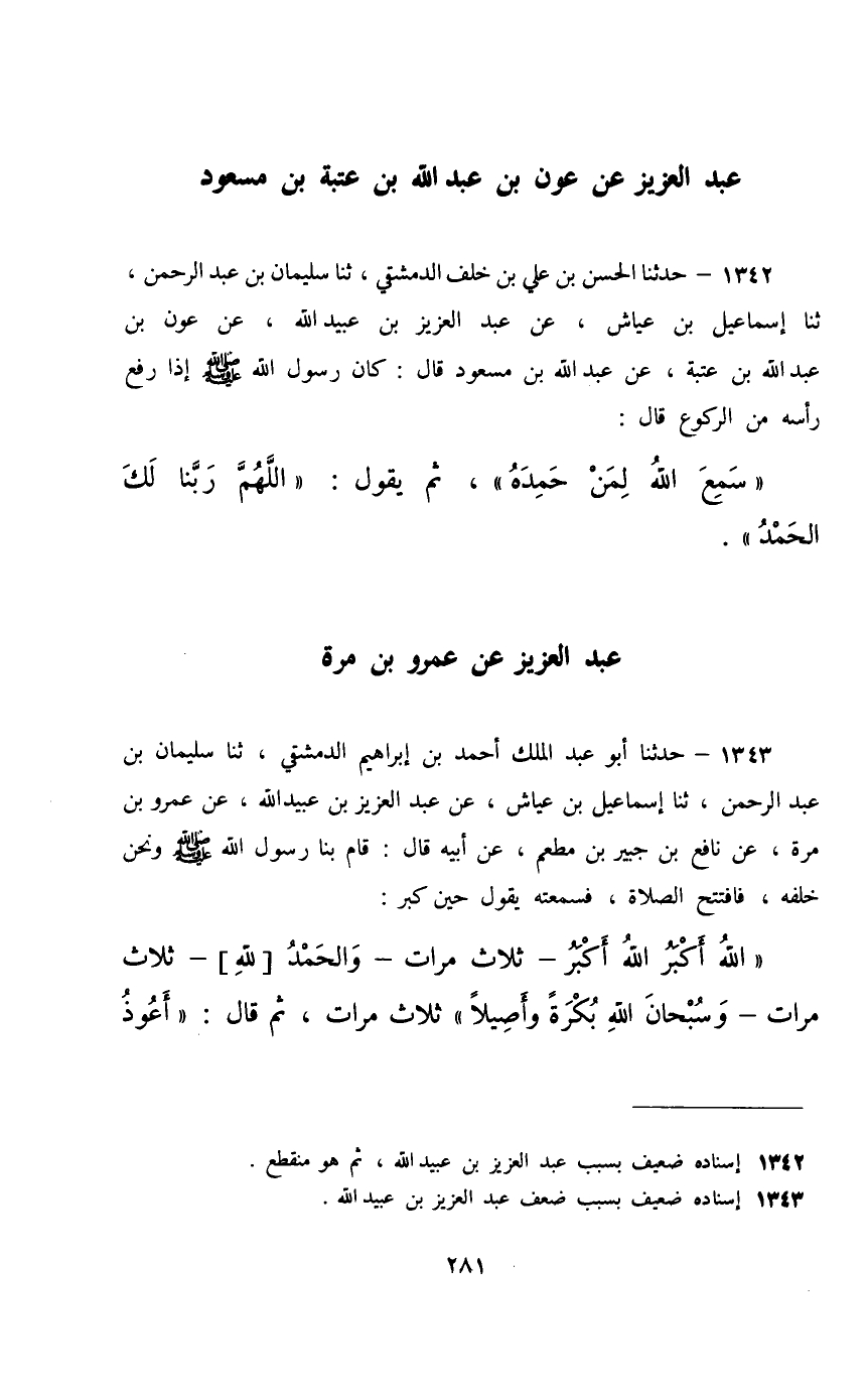 1342 - حَدَّثَنَا الْحَسَنُ بْنُ عَلِيِّ بْنِ خَلَفٍ الدِّمَشْقِيُّ، ثَنَا سُلَيْمَانُ بْنُ عَبْدِ الرَّحْمَنِ، ثَنَا إِسْمَاعِيلُ بْنُ عَيَّاشٍ، عَنْ عَبْدِ الْعَزِيزِ بْنِ عُبَيْدِ اللَّهِ، عَنْ عَوْنِ بْنِ عَبْدِ اللَّهِ بْنِ عُتْبَةَ، عَنْ عَبْدِ اللَّهِ بْنِ مَسْعُودٍ، قَالَ: كَانَ رَسُولُ اللَّهِ صَلَّى اللهُ عَلَيْهِ وَسَلَّمَ §إِذَا رَفَعَ رَأْسَهُ مِنَ الرُّكُوعِ قَالَ: «سَمِعَ اللَّهُ لِمَنْ حَمِدَهُ» , ثُمَّ يَقُولُ: «اللَّهُمَّ رَبَّنَا لَكَ الْحَمْدُ»