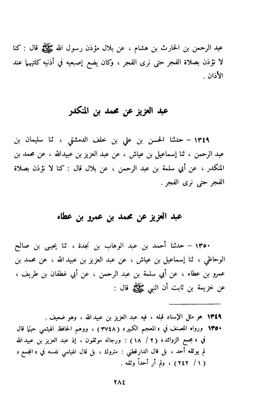 1349 - حَدَّثَنَا الْحَسَنُ بْنُ عَلِيِّ بْنِ خَلَفٍ الدِّمَشْقِيُّ، ثَنَا سُلَيْمَانُ بْنُ عَبْدِ الرَّحْمَنِ، ثَنَا إِسْمَاعِيلُ بْنُ عَيَّاشٍ، عَنْ عَبْدِ الْعَزِيزِ بْنِ عُبَيْدِ اللَّهِ، عَنْ مُحَمَّدِ بْنِ الْمُنْكَدِرِ، عَنْ أَبِي سَلَمَةَ بْنِ عَبْدِ الرَّحْمَنِ، عَنْ بِلَالٍ، قَالَ: §«كُنَّا لَا نُؤَذِّنُ بِصَلَاةِ الْفَجْرِ حَتَّى نَرَى الْفَجْرَ»