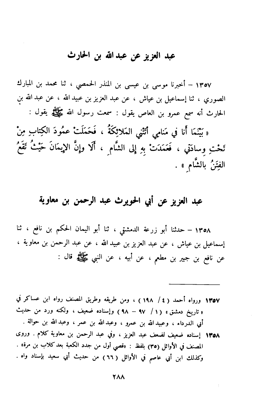 1357 - أَخْبَرَنَا مُوسَى بْنُ عِيسَى بْنِ الْمُنْذِرِ الْحِمْصِيُّ، ثَنَا مُحَمَّدُ بْنُ الْمُبَارَكِ الصُّورِيُّ، ثَنَا إِسْمَاعِيلُ بْنُ عَيَّاشٍ، عَنْ عَبْدِ الْعَزِيزِ بْنِ عُبَيْدِ اللَّهِ، عَنْ عَبْدِ اللَّهِ بْنِ الْحَارِثِ، أَنَّهُ سَمِعَ عَمْرَو بْنَ الْعَاصِ، يَقُولُ: سَمِعْتُ رَسُولَ اللَّهِ صَلَّى اللهُ عَلَيْهِ وَسَلَّمَ يَقُولُ: «بَيْنَمَا أَنَا فِي مَنَامِي أَتَتْنِي الْمَلَائِكَةُ فَحَمَلَتْ عَمُودَ الْكِتَابِ مِنْ تَحْتِ وِسَادَتِي , فَعَمَدْتُ بِهِ إِلَى الشَّامِ , أَلَا وَإِنَّ §الْإِيمَانَ حَيْثُ تَقَعُ الْفِتَنُ بِالشَّامِ»