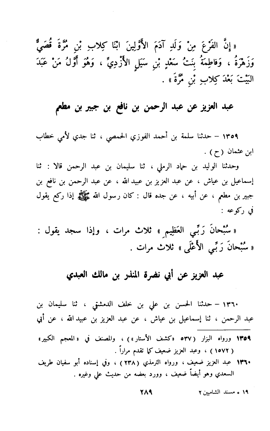 1359 - حَدَّثَنَا سَلَمَةُ بْنُ أَحْمَدَ الْفَوْزِيُّ الْحِمْصِيُّ، ثَنَا جَدِّي لِأُمِّي خَطَّابُ بْنُ عُثْمَانَ حَ وَحَدَّثَنَا الْوَلِيدُ بْنُ حَمَّادٍ الرَّمْلِيُّ، ثَنَا سُلَيْمَانُ بْنُ عَبْدِ الرَّحْمَنِ، قَالَا: ثَنَا إِسْمَاعِيلُ بْنُ عَيَّاشٍ، عَنْ عَبْدِ الْعَزِيزِ بْنِ عُبَيْدِ اللَّهِ، عَنْ عَبْدِ الرَّحْمَنِ بْنِ نَافِعِ بْنِ جُبَيْرِ بْنِ معطمٍ، عَنْ أَبِيهِ، عَنْ جَدِّهِ، قَالَ: كَانَ رَسُولُ اللَّهِ صَلَّى اللهُ عَلَيْهِ وَسَلَّمَ §إِذَا رَكَعَ يَقُولُ فِي رُكُوعِهِ: «سُبْحَانَ رَبِّي الْعَظِيمِ» , ثَلَاثَ مَرَّاتٍ , وَإِذَا سَجَدَ يَقُولُ: «سُبْحَانَ رَبِّي الْأَعْلَى» , ثَلَاثَ مَرَّاتٍ "