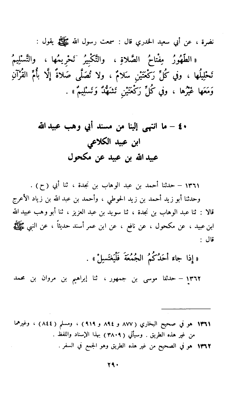 1361 - حَدَّثَنَا أَحْمَدُ بْنُ عَبْدِ الْوَهَّابِ بْنِ نَجْدَةَ، ثَنَا أَبِي، حَ، وَحَدَّثَنَا أَبُو زَيْدٍ أَحْمَدُ بْنُ زَيْدٍ الْحَوْطِيُّ، وَأَحْمَدُ بْنُ عَبْدِ اللَّهِ بْنِ زِيَادٍ الْأَعْرَجُ، قَالَا: ثَنَا عَبْدُ الْوَهَّابِ بْنُ نَجْدَةَ، ثَنَا سُوَيْدُ بْنُ عَبْدِ الْعَزِيزِ، ثَنَا أَبُو وَهْبٍ عُبَيْدُ اللَّهِ بْنُ عُبَيْدٍ , عَنْ مَكْحُولٍ، عَنْ نَافِعٍ، عَنِ ابْنِ عُمَرَ، أَسْنَدَ حَدِيثًا عَنِ النَّبِيِّ صَلَّى اللهُ عَلَيْهِ وَسَلَّمَ قَالَ: §«إِذَا جَاءَ أَحَدُكُمُ الْجُمُعَةَ فَلْيَغْتَسِلْ»
