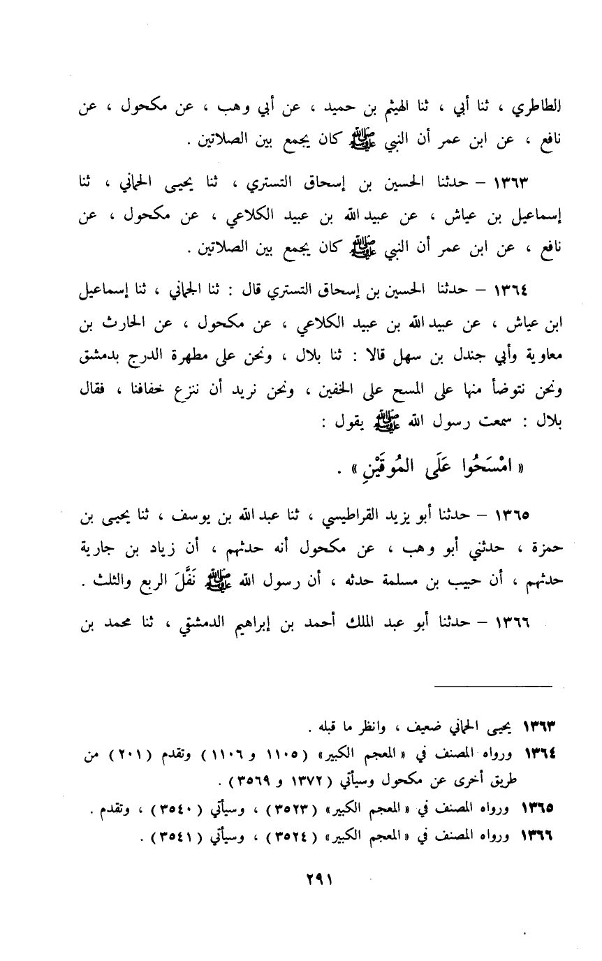1363 - حَدَّثَنَا الْحُسَيْنُ بْنُ إِسْحَاقَ التُّسْتَرِيُّ، ثَنَا يَحْيَى الْحِمَّانِيُّ، ثَنَا إِسْمَاعِيلُ بْنُ عَيَّاشٍ، عَنْ عُبَيْدِ اللَّهِ بْنِ عُبَيْدٍ الْكَلَاعِيِّ، عَنْ مَكْحُولٍ، عَنْ نَافِعٍ، عَنِ ابْنِ عُمَرَ، أَنَّ النَّبِيَّ صَلَّى اللهُ عَلَيْهِ وَسَلَّمَ كَانَ §يَجْمَعُ بَيْنَ الصَّلَاتَيْنِ