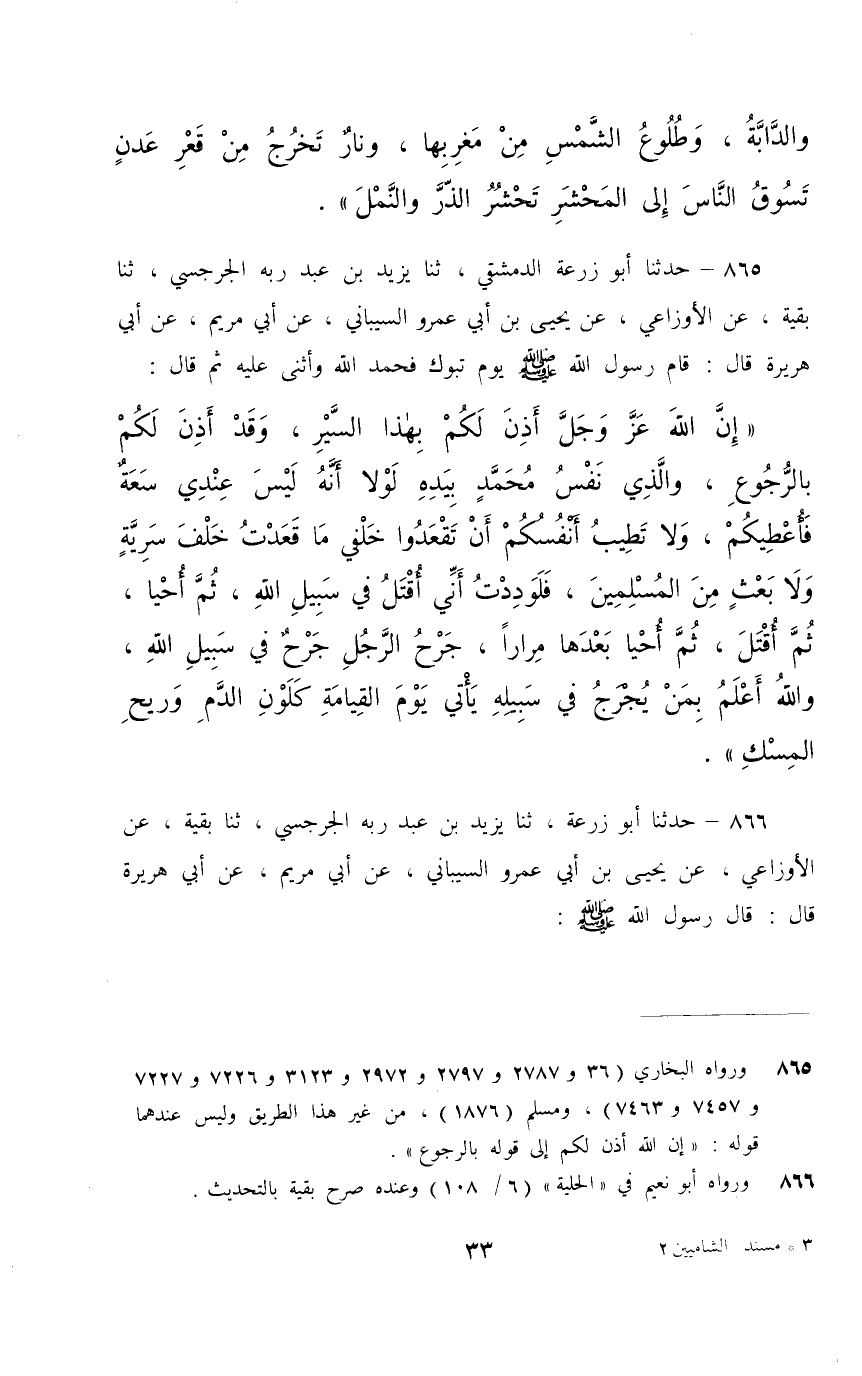 865 - حَدَّثَنَا أَبُو زُرْعَةَ الدِّمَشْقِيُّ، ثَنَا يَزِيدُ بْنُ عَبْدِ رَبِّهِ الْجُرْجُسِيُّ، ثَنَا بَقِيَّةُ، عَنِ الْأَوْزَاعِيِّ، عَنْ يَحْيَى بْنِ أَبِي عَمْرٍو السَّيْبَانِيِّ، عَنْ أَبِي مَرْيَمَ، عَنْ أَبِي هُرَيْرَةَ، قَالَ: قَامَ رَسُولُ اللَّهِ صَلَّى اللهُ عَلَيْهِ وَسَلَّمَ يَوْمَ تَبُوكَ فَحَمِدَ اللَّهَ وَأَثْنَى عَلَيْهِ ثُمَّ قَالَ: §«إِنَّ اللَّهَ عَزَّ وَجَلَّ أَذِنَ لَكُمْ بِهَذَا السَّيْرِ وَقَدْ أَذِنَ لَكُمْ بِالرُّجُوعِ , وَالَّذِي نَفْسُ مُحَمَّدٍ بِيَدِهِ لَوْلَا أَنَّهُ لَيْسَ عِنْدِي سَعَةٌ فَأُعْطِيكُمْ وَلَا تَطِيبُ أَنْفُسُكُمْ أَنْ تَقْعُدُوا خَلْفِي مَا قَعَدْتُ خَلْفَ سَرِيَّةٍ وَلَا بَعْثٍ مِنَ الْمُسْلِمِينَ , فَلَوَدِدْتُ أَنِّي أُقْتَلُ فِي سَبِيلِ اللَّهِ ثُمَّ أَحْيَا ثُمَّ أُقْتَلُ ثُمَّ أَحْيَا بَعْدَهَا مِرَارًا , جُرْحُ الرَّجُلِ جُرْحٌ فِي سَبِيلِ اللَّهِ , وَاللَّهُ أَعْلَمُ بِمَنْ يُجْرَحُ فِي سَبِيلِهِ يَأْتِي يَوْمَ الْقِيَامَةِ كَلَوْنِ الدَّمِ وَرِيحِ الْمِسْكِ»