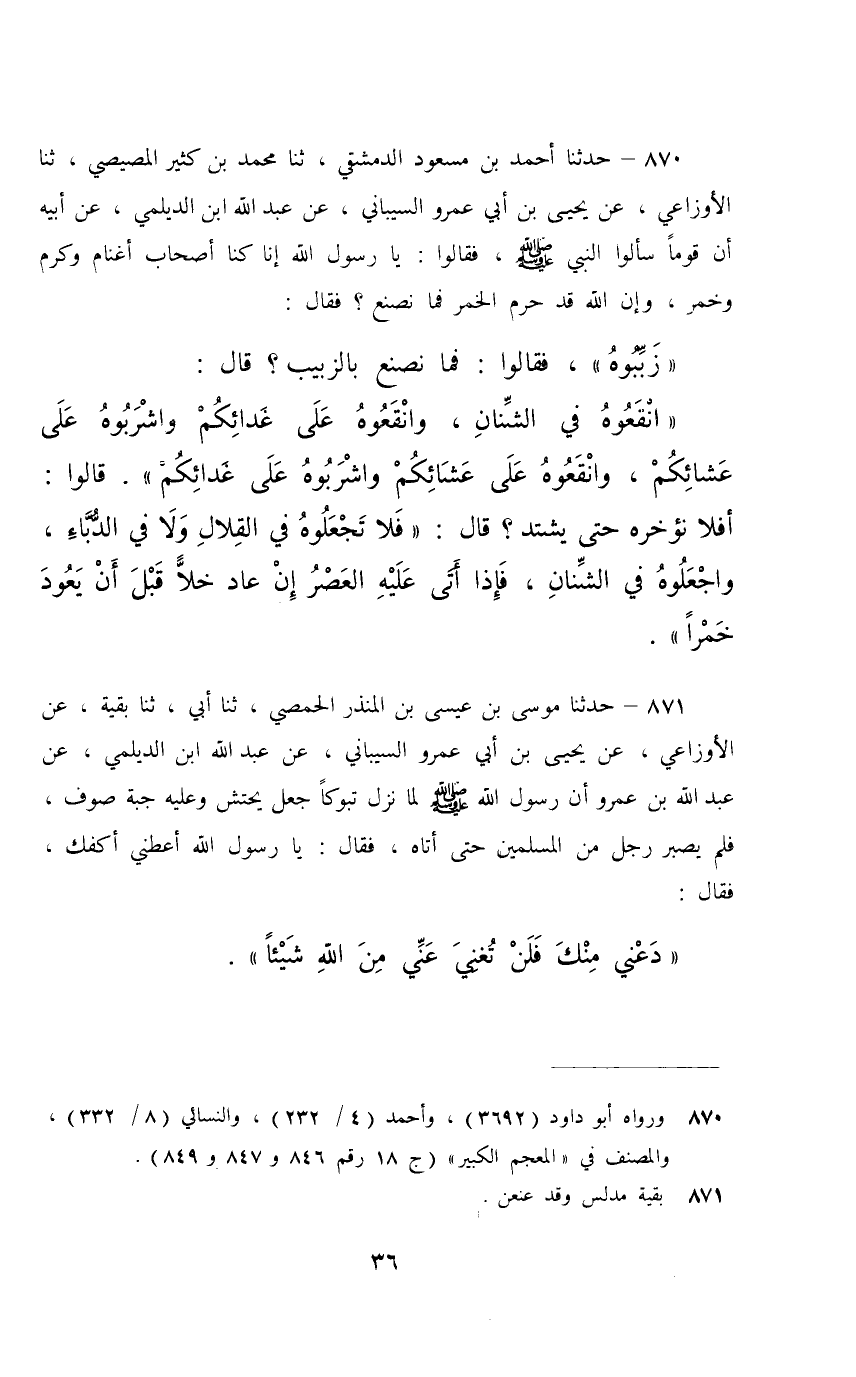 870 - حَدَّثَنَا أَحْمَدُ بْنُ مَسْعُودٍ الدِّمَشْقِيُّ، ثَنَا مُحَمَّدُ بْنُ كَثِيرٍ الْمِصِّيصِيُّ، ثَنَا الْأَوْزَاعِيُّ، عَنْ يَحْيَى بْنِ أَبِي عَمْرٍو السَّيْبَانِيِّ، عَنْ عَبْدِ اللَّهِ بْنِ الدَّيْلَمِيِّ، عَنْ أَبِيهِ، أَنَّ قَوْمًا، سَأَلُوا النَّبِيَّ صَلَّى اللهُ عَلَيْهِ وَسَلَّمَ فَقَالُوا: يَا رَسُولَ اللَّهِ إِنَّا كُنَّا أَصْحَابُ أَغْنَامٍ وَكَرْمٍ وَخَمْرٍ , وَإِنَّ اللَّهَ قَدْ حَرَّمَ الْخَمْرَ , فَمَا نَصْنَعُ؟ فَقَالَ: «زَبِّبُوهُ» فَقَالُوا فَمَا نَصْنَعُ بِالزَّبِيبِ؟ قَالَ: §«انْقَعُوهُ فِي الشِّنَانِ، وَانْقَعُوهُ عَلَى غَدَائِكُمْ وَاشْرَبُوهُ عَلَى عَشَائِكُمْ، وَانْقَعُوهُ عَلَى عَشَائِكُمْ وَاشْرَبُوهُ عَلَى غَدَائِكُمْ» قَالُوا: أَفَلَا نُؤَخِّرُهُ حَتَّى يَشْتَدَّ؟ قَالَ: «فَلَا تَجْعَلُوهُ فِي الْقِلَالِ وَلَا فِي الدُّبَّاءِ، وَاجْعَلُوهُ فِي الشِّنَانِ، فَإِذَا أَتَى عَلَيْهِ الْعَصْرُ إِنْ عَادَ خَلًّا قَبْلَ أَنْ يَعُودَ خَمْرًا»
