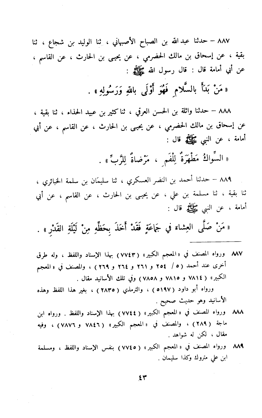 887 - حَدَّثَنَا عَبْدُ اللَّهِ بْنُ الصَّبَّاحِ الْأَصْبَهَانِيُّ، ثَنَا الْوَلِيدُ بْنُ شُجَاعٍ، ثَنَا بَقِيَّةُ، عَنْ إِسْحَاقَ بْنِ مَالِكٍ الْحَضْرَمِيِّ، عَنْ يَحْيَى بْنِ الْحَارِثِ، عَنِ الْقَاسِمِ، عَنْ أَبِي أُمَامَةَ، قَالَ: قَالَ رَسُولُ اللَّهِ صَلَّى اللهُ عَلَيْهِ وَسَلَّمَ: §«مَنْ بَدَأَ بِالسَّلَامِ فَهُوَ أَوْلَى بِاللَّهِ وَرَسُولِهِ»