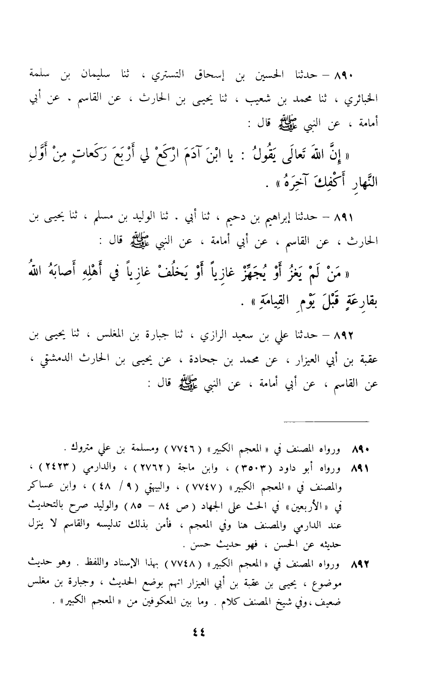890 - حَدَّثَنَا الْحُسَيْنُ بْنُ إِسْحَاقَ التُّسْتَرِيُّ، ثَنَا سُلَيْمَانُ بْنُ سَلَمَةَ الْخَبَائِرِيُّ، ثَنَا مُحَمَّدُ بْنُ شُعَيْبٍ، ثَنَا يَحْيَى بْنُ الْحَارِثِ، عَنِ الْقَاسِمِ، عَنْ أَبِي أُمَامَةَ، عَنِ النَّبِيِّ صَلَّى اللهُ عَلَيْهِ وَسَلَّمَ قَالَ: إِنَّ اللَّهَ تَعَالَى يَقُولُ: يَا ابْنَ آدَمَ §ارْكَعْ لِي أَرْبَعَ رَكَعَاتٍ مِنْ أَوَّلِ النَّهَارِ أَكْفِكَ آخِرَهُ "