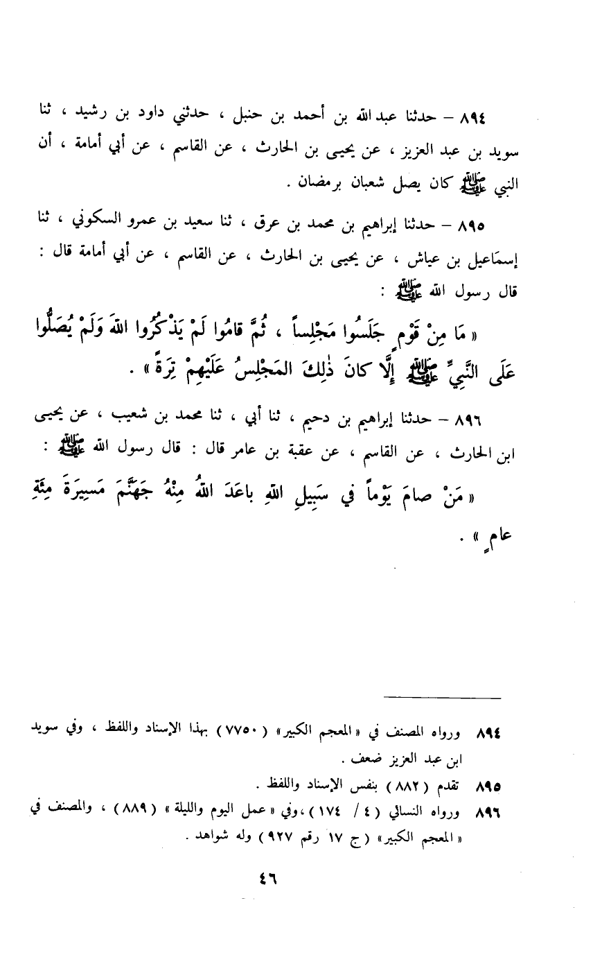 894 - حَدَّثَنَا عَبْدُ اللَّهِ بْنُ أَحْمَدَ بْنِ حَنْبَلٍ، حَدَّثَنِي دَاوُدُ بْنُ رُشَيْدٍ، ثَنَا سُوَيْدُ بْنُ عَبْدِ الْعَزِيزِ، عَنْ يَحْيَى بْنِ الْحَارِثِ، عَنِ الْقَاسِمِ، عَنْ أَبِي أُمَامَةَ، أَنَّ النَّبِيَّ صَلَّى اللهُ عَلَيْهِ وَسَلَّمَ §كَانَ يَصِلُ شَعْبَانَ بِرَمَضَانَ