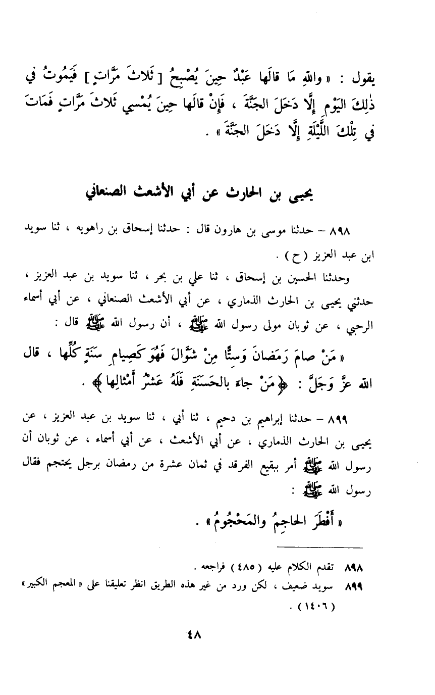 899 - حَدَّثَنَا إِبْرَاهِيمُ بْنُ دُحَيْمٍ، ثَنَا أَبِي، ثَنَا سُوَيْدُ بْنُ عَبْدِ الْعَزِيزِ، عَنْ يَحْيَى بْنِ الْحَارِثِ الذِّمَارِيِّ، عَنْ أَبِي الْأَشْعَثَ، عَنْ أَبِي أَسْمَاءَ، عَنْ ثَوْبَانَ، أَنَّ رَسُولَ اللَّهِ صَلَّى اللهُ عَلَيْهِ وَسَلَّمَ مَرَّ بِبَقِيعِ الْغَرْقَدِ فِي ثَمَانِ عَشْرَةَ مِنْ رَمَضَانَ بِرَجُلٍ يَحْتَجِمُ فَقَالَ رَسُولُ اللَّهِ صَلَّى اللهُ عَلَيْهِ وَسَلَّمَ: §«أَفْطَرَ الْحَاجِمُ وَالْمَحْجُومُ»
