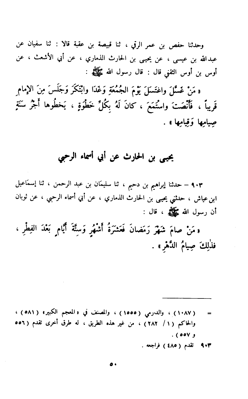 903 - حَدَّثَنَا إِبْرَاهِيمُ بْنُ دُحَيْمٍ، ثَنَا سُلَيْمَانُ بْنُ عَبْدِ الرَّحْمَنِ، ثَنَا إِسْمَاعِيلُ بْنُ عَيَّاشٍ، حَدَّثَنِي يَحْيَى بْنُ الْحَارِثِ الذِّمَارِيِّ، عَنْ أَبِي أَسْمَاءَ الرَّحَبِيِّ، عَنْ ثَوْبَانَ، أَنَّ رَسُولَ اللَّهِ صَلَّى اللهُ عَلَيْهِ وَسَلَّمَ قَالَ: «§مَنْ صَامَ شَهْرَ رَمَضَانَ فَعَشَرَةُ أَشْهُرٍ، وَسِتَّةَ أَيَّامٍ بَعْدَ الْفِطْرِ، فَذَلِكَ صِيَامُ الدَّهْرِ»