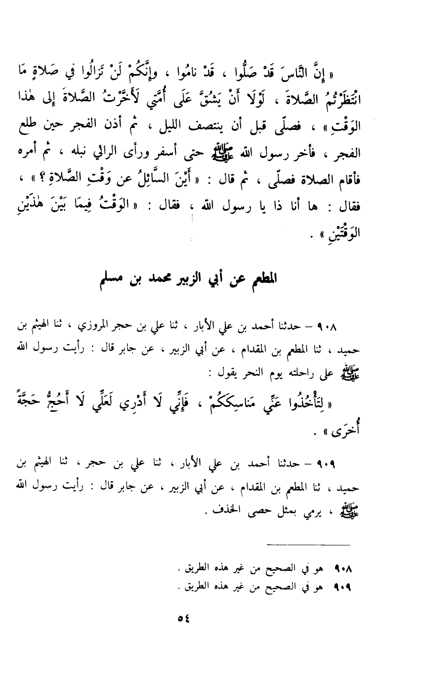 908 - حَدَّثَنَا أَحْمَدُ بْنُ عَلِيٍّ الْأَبَّارُ، ثَنَا عَلِيُّ بْنُ حُجْرٍ الْمَرْوَزِيُّ، ثَنَا الْهَيْثَمُ بْنُ حُمَيْدٍ، ثَنَا الْمُطْعِمُ بْنُ الْمِقْدَامِ، عَنْ أَبِي الزُّبَيْرِ، عَنْ جَابِرٍ، قَالَ: رَأَيْتُ رَسُولَ اللَّهِ صَلَّى اللهُ عَلَيْهِ وَسَلَّمَ عَلَى رَاحِلَتِهِ يَوْمَ النَّحْرِ يَقُولُ: §«لِتَأْخُذُوا عَنِّي مَنَاسِكَكُمْ , فَإِنِّي لَا أَدْرِي لَعَلِّي لَا أَحُجُّ حَجَّةً أُخْرَى»