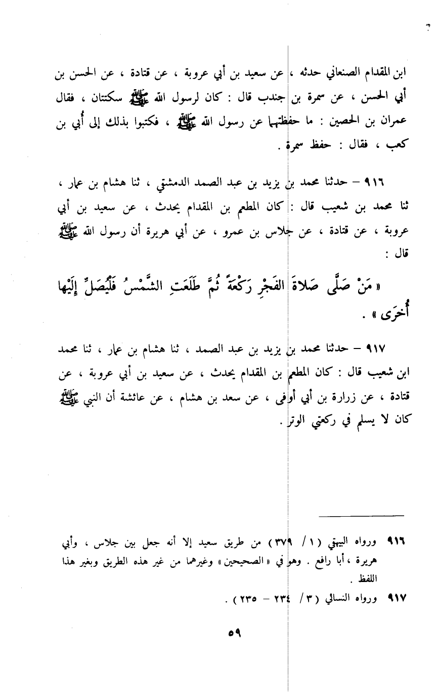 917 - حَدَّثَنَا مُحَمَّدُ بْنُ يَزِيدَ بْنِ عَبْدِ الصَّمَدِ، ثَنَا هِشَامُ بْنُ عَمَّارٍ، ثَنَا مُحَمَّدُ بْنُ شُعَيْبٍ، قَالَ: كَانَ الْمُطْعِمُ بْنُ الْمِقْدَامِ يُحَدِّثُ عَنْ سَعِيدِ بْنِ أَبِي عَرُوبَةَ، عَنْ قَتَادَةَ، عَنْ زُرَارَةَ بْنِ أَبِي أَوْفَى، عَنْ سَعْدِ بْنِ هِشَامٍ، عَنْ عَائِشَةَ، أَنَّ النَّبِيَّ صَلَّى اللهُ عَلَيْهِ وَسَلَّمَ كَانَ §لَا يُسَلِّمُ فِي رَكْعَتَيِ الْوِتْرِ