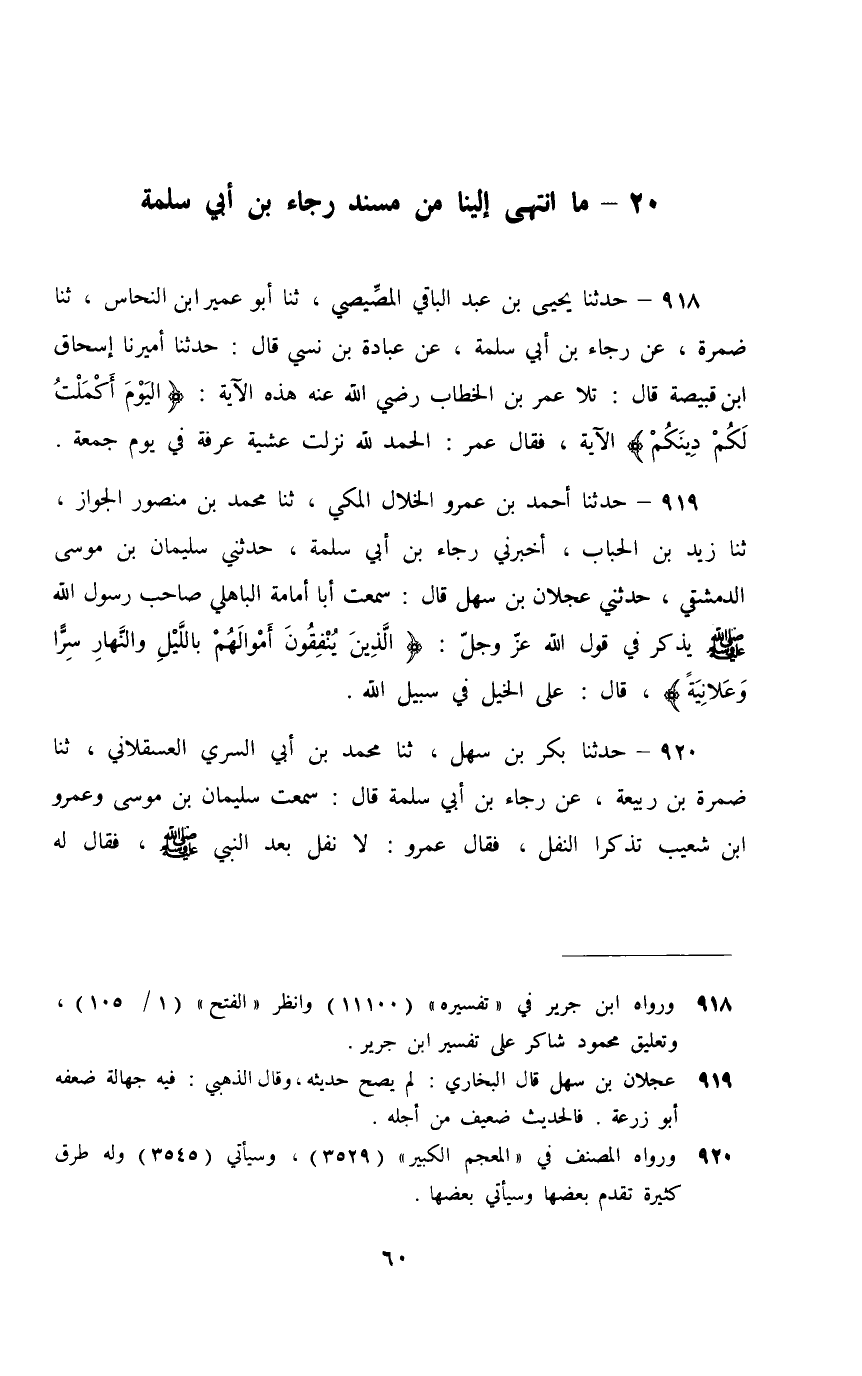 920 - حَدَّثَنَا بَكْرُ بْنُ سَهْلٍ، ثَنَا مُحَمَّدُ بْنُ أَبِي السَّرِيِّ الْعَسْقَلَانِيُّ، ثَنَا ضَمْرَةُ بْنُ رَبِيعَةَ، عَنْ رَجَاءِ بْنِ أَبِي سَلَمَةَ، قَالَ: سَمِعْتُ سُلَيْمَانَ بْنَ مُوسَى، وَعَمْرَو بْنَ شُعَيْبٍ، تَذَكَّرَا النَّفْلَ فَقَالَ عَمْرٌو: لَا نَفْلَ بَعْدَ النَّبِيِّ صَلَّى اللهُ عَلَيْهِ وَسَلَّمَ , فَقَالَ لَهُ سُلَيْمَانُ: شَغَلَكَ أَكْلُ الزَّبِيبِ بِالطَّائِفِ , ثَنَا مَكْحُولٌ , عَنْ زِيَادِ بْنِ جَارِيَةَ اللَّخْمِيِّ , عَنْ حَبِيبِ بْنِ مَسْلَمَةَ أَنَّ رَسُولَ اللَّهِ صَلَّى اللهُ عَلَيْهِ وَسَلَّمَ §«نَفَلَ فِي الْبَدْءةِ الرُّبُعَ وَفِي الرَّجْعَةِ الثُّلُثَ [بَعْدَ الْخُمُسِ] »