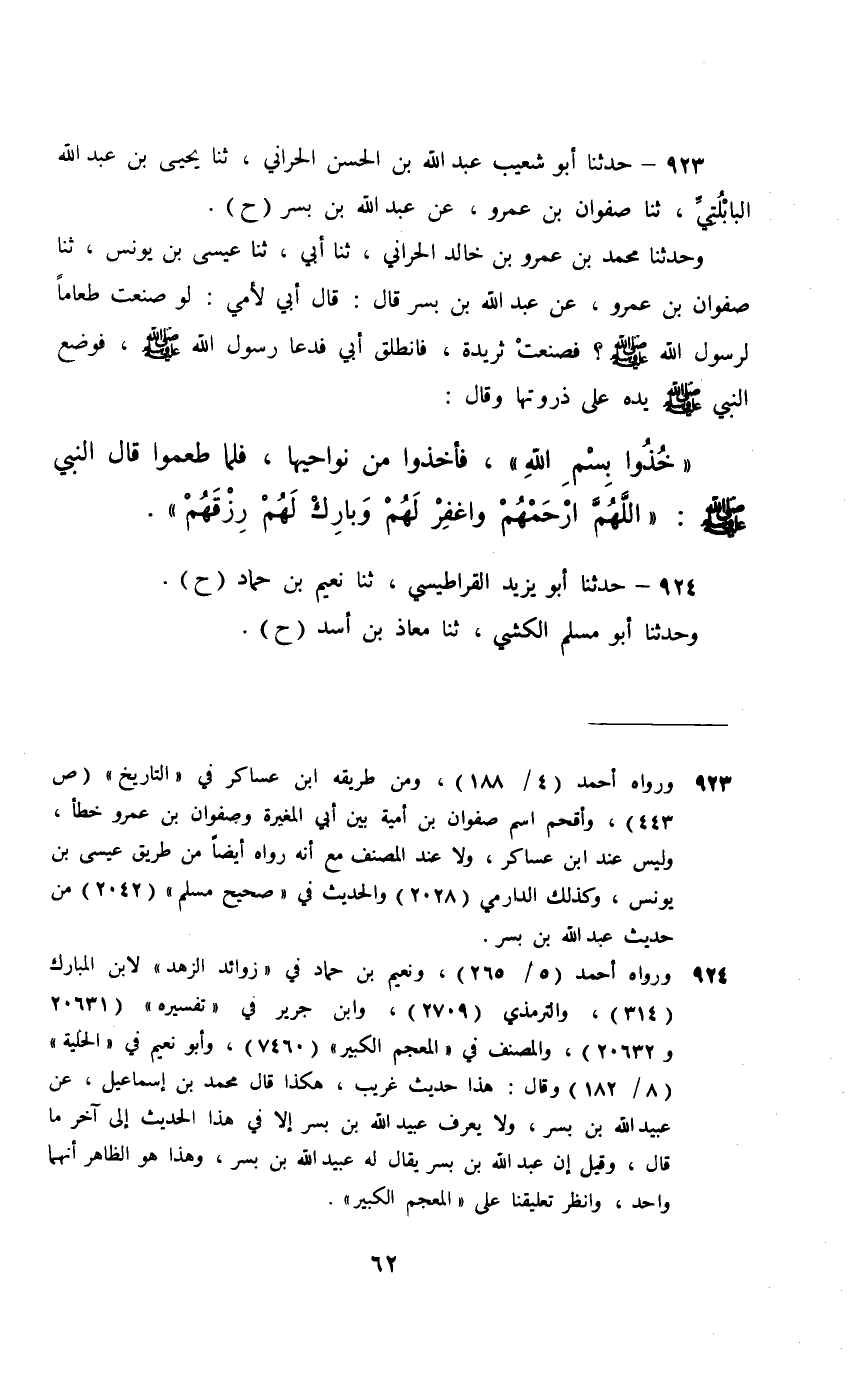 923 - حَدَّثَنَا أَبُو شُعَيْبٍ عَبْدُ اللَّهِ بْنُ الْحَسَنِ الْحَرَّانِيُّ، ثَنَا يَحْيَى بْنُ عَبْدِ اللَّهِ الْبَابْلُتِيُّ، ثَنَا صَفْوَانُ بْنُ عَمْرٍو، عَنْ عَبْدِ اللَّهِ بْنِ بُسْرٍ، حَ وَحَدَّثَنَا مُحَمَّدُ بْنُ عَمْرِو بْنِ خَالِدٍ الْحَرَّانِيُّ، ثَنَا أَبِي، ثَنَا عِيسَى بْنُ يُونُسَ، ثَنَا صَفْوَانُ بْنُ عَمْرٍو، عَنْ عَبْدِ اللَّهِ بْنِ بُسْرٍ، قَالَ: قَالَ أَبِي لِأُمِّي: لَوْ صَنَعْتِ طَعَامًا لِرَسُولِ اللَّهِ صَلَّى اللهُ عَلَيْهِ وَسَلَّمَ , فَصَنَعَتْ ثَرِيدَةً , فَانْطَلَقَ أَبِي , فَدَعَا رَسُولَ اللَّهِ صَلَّى اللهُ عَلَيْهِ وَسَلَّمَ، فَوَضَعَ النَّبِيُّ صَلَّى اللهُ عَلَيْهِ وَسَلَّمَ يَدَهُ عَلَى ذُرْوَتِهَا، وَقَالَ: «خُذُوا بِسْمِ اللَّهِ» فَأَخَذُوا مِنْ نَوَاحِيهَا , فَلَمَّا طَعِمُوا قَالَ النَّبِيُّ صَلَّى اللهُ عَلَيْهِ وَسَلَّمَ: §" اللَّهُمَّ ارْحَمْهُمْ وَاغْفِرْ لَهُمْ وَبَارِكْ لَهُمْ رِزْقَهُمْ