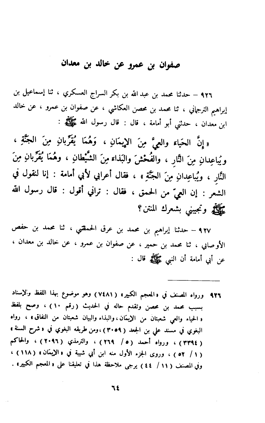 926 - حَدَّثَنَا مُحَمَّدُ بْنُ عَبْدِ اللَّهِ بْنِ بَكْرٍ السَّرَّاجُ الْعَسْكَرِيُّ، ثَنَا إِسْمَاعِيلُ بْنُ إِبْرَاهِيمَ التَّرْجُمَانِيُّ، ثَنَا مُحَمَّدُ بْنُ مِحْصَنٍ الْعُكَاشِيُّ، عَنْ صَفْوَانَ بْنِ عَمْرٍو، عَنْ خَالِدِ بْنِ مَعْدَانَ، حَدَّثَنِي أَبُو أُمَامَةَ، قَالَ: قَالَ رَسُولُ اللَّهِ صَلَّى اللهُ عَلَيْهِ وَسَلَّمَ: «إِنَّ §الْحَيَاءَ وَالْعِيَّ مِنَ الْإِيمَانِ وَهُمَا يُقَرِّبَانِ مِنَ الْجَنَّةِ وَيُبَاعِدَانِ مِنَ النَّارِ , وَالْفُحْشُ وَالْبَذَاءُ مِنَ الشَّيْطَانِ , وَهُمَا يُقَرِّبَانِ مِنَ النَّارِ، وَيُبَاعِدَانِ مِنَ الْجَنَّةِ» فَقَالَ أَعْرَابِيُّ لِأَبِي أُمَامَةَ: إِنَّا لَنَقُولُ فِي الشَّعْرِ: إِنَّ الْعِيَّ مِنَ الْحُمْقِ , فَقَالَ: تَرَانِي أَقُولُ: قَالَ رَسُولُ اللَّهِ صَلَّى اللهُ عَلَيْهِ وَسَلَّمَ: " وَتُجِيبُنِي بِشِعْرِكَ الْمُنَتَّنِ؟