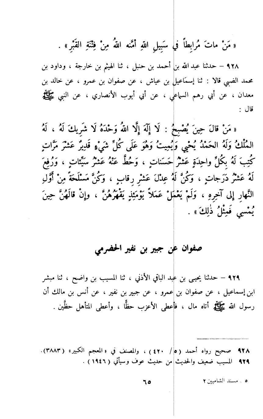 928 - حَدَّثَنَا عَبْدُ اللَّهِ بْنُ أَحْمَدَ بْنِ حَنْبَلٍ، ثَنَا الْهَيْثَمُ بْنُ خَارِجَةَ، وَدَاوُدُ بْنُ مُحَمَّدٍ الضَّبِّيُّ، قَالَا: ثَنَا إِسْمَاعِيلُ بْنُ عَيَّاشٍ، عَنْ صَفْوَانَ بْنِ عَمْرٍو، عَنْ خَالِدِ بْنِ مَعْدَانَ، عَنْ أَبِي رُهْمٍ السَّمَاعِيُّ، عَنْ أَبِي أَيُّوبَ الْأَنْصَارِيِّ، عَنِ النَّبِيِّ صَلَّى اللهُ عَلَيْهِ وَسَلَّمَ، قَالَ: §«مَنْ قَالَ حِينَ يُصْبِحُ لَا إِلَهَ إِلَّا اللَّهُ وَحْدَهُ لَا شَرِيكَ لَهُ، لَهُ الْمُلْكُ وَلَهُ الْحَمْدُ، يُحْيِي وَيُمِيتُ، وَهُوَ عَلَى كُلِّ شَيْءٍ قَدِيرٌ، عَشْرَ مَرَّاتٍ؛ كُتِبَ لَهُ بِكُلِّ وَاحِدَةٍ عَشْرُ حَسَنَاتٍ , وَحُطَّ عَنْهُ عَشَرُ سَيِّئَاتٍ , وَرُفِعَ لَهُ عَشْرُ دَرَجَاتٍ , وَكُنَّ لَهُ عَدْلَ عَشْرِ رِقَابٍ , وَكُنَّ مَسْلَحَةً مِنْ أَوَّلِ النَّهَارِ إِلَى آخِرِهِ , وَلَمْ يَعْمَلْ عَمَلًا يَوْمَئِذٍ يَقْهَرُهُنَّ , وَإِنْ قَالَهُنَّ حِينَ يُمْسِيَ؛ فَمِثْلُ ذَلِكَ»