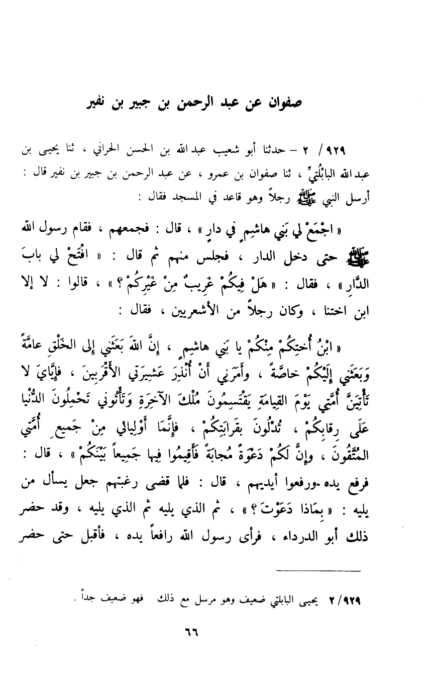 حَدَّثَنَا أَبُو شُعَيْبٍ عَبْدُ اللَّهِ بْنُ الْحَسَنِ الْحَرَّانِيُّ، ثَنَا يَحْيَى بْنُ عَبْدِ اللَّهِ الْبَابْلُتِيُّ، ثَنَا صَفْوَانُ بْنُ عَمْرٍو، عَنْ عَبْدِ الرَّحْمَنِ بْنِ جُبَيْرِ بْنِ نُفَيْرٍ، قَالَ: أَرْسَلَ النَّبِيُّ صَلَّى اللهُ عَلَيْهِ وَسَلَّمَ رَجُلًا وَهُوَ قَاعِدٌ فِي الْمَسْجِدِ فَقَالَ: «§اجْمَعْ لِي بَنِي هَاشِمٍ فِي دَارٍ» قَالَ: فَجَمَعَهُمْ , فَقَامَ رَسُولُ اللَّهِ صَلَّى اللهُ عَلَيْهِ وَسَلَّمَ حَتَّى دَخَلَ الدَّارَ , فَجَلَسَ مِنْهُمْ , ثُمَّ قَالَ: «افْتَحْ لِي بَابَ الدَّارِ» فَقَالَ: «هَلْ فِيكُمْ غَرِيبٌ مِنْ غَيْرِكُمْ؟» قَالُوا: لَا , إِلَّا ابْنُ أُخْتِنَا , وَكَانَ رَجُلًا مِنَ الْأَشْعَرِيِّينَ , فَقَالَ: «ابْنُ أُخْتِكُمْ مِنْكُمْ , يَا بَنِي هَاشِمٍ , إِنَّ اللَّهَ بَعَثَنِي إِلَى الْخَلْقِ عَامَّةً , وَبَعَثَنِي إِلَيْكُمْ خَاصَّةً , وَأَمَرَنِي أَنْ أُنْذِرَ عَشِيرَتِي الْأَقْرَبِينَ , فَإِيَّايَ لَا تَأْتِينَ أُمَّتِي يَوْمَ الْقِيَامَةِ يَقْتَسِمُونَ مُلْكَ الْآخِرَةِ وَتَأْتُونِي تَحْمِلُونَ الدُّنْيَا عَلَى رِقَابِكُمْ تُدْلُونَ بِقَرَابَتِكُمْ , فَإِنَّمَا أَوْلِيَائِي مِنْ جَمِيعِ أُمَّتِي الْمُتَّقُونَ , وَإِنَّ لَكُمْ دَعْوَةٌ مُجَابَةٌ، فَأَقِيمُوا فِيهَا جَمِيعًا بَيْنَكُمْ» قَالَ: فَرَفَعَ يَدَهُ وَرَفَعُوا أَيْدِيَهُمْ , قَالَ: فَلَمَّا قَضَى رَغْبَتَهُمْ جَعَلَ يَسْأَلُ مَنْ يَلِيهِ: «بِمَاذَا دَعَوْتَ؟» ثُمَّ الَّذِي يَلِيهِ ثُمَّ الَّذِي يَلِيهِ , وَقَدْ حَضَرَ ذَلِكَ أَبُو الدَّرْدَاءِ فَرَأَى رَسُولَ اللَّهِ صَلَّى اللهُ عَلَيْهِ وَسَلَّمَ رَافِعًا يَدَهُ فَأَقْبَلَ حَتَّى حَضَرَ مَعَهُمُ الرَّغْبَةَ , فَسَأَلَهُ يَوْمَئِذٍ: «بِمَ دَعَوْتَ بِهِ يَا عُوَيْمِرُ» قَالَ: قُلْتُ: اللَّهُمَّ أَسْأَلُكَ جَنَّاتِ الْفِرْدَوْسِ نُزُلًا وَجَنَّاتِ عَدْنٍ نَفْلًا فِي مُعَافَاةٍ مِنْكَ وَرَحْمَةٍ وَخَيْرٍ عَافِيَةٍ وَعِلْمٍ يُنْسَأُ , فَأَشَارَ رَسُولُ اللَّهِ صَلَّى اللهُ عَلَيْهِ وَسَلَّمَ بِيَدِهِ مَرَّةً أَوْ مَرَّتَيْنِ يَقُولُ: «ذَهَبْتَ بِهَا يَا عُوَيْمِرُ»