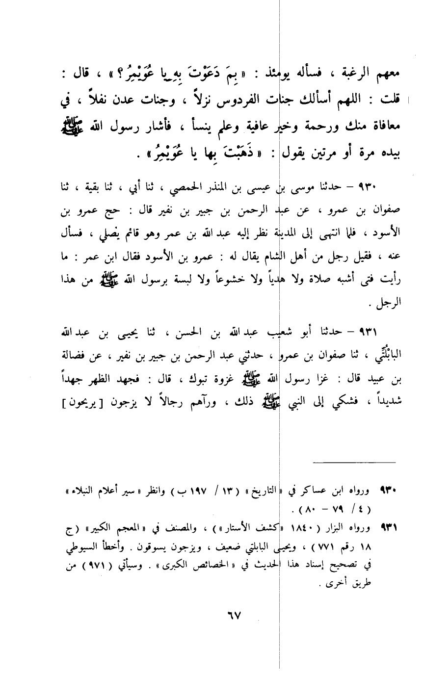 930 - حَدَّثَنَا مُوسَى بْنُ عِيسَى بْنِ الْمُنْذِرِ الْحِمْصِيُّ، ثَنَا أَبِي، ثَنَا بَقِيَّةُ، ثَنَا صَفْوَانُ بْنُ عَمْرٍو، عَنْ عَبْدِ الرَّحْمَنِ بْنِ جُبَيْرِ بْنِ نُفَيْرٍ، قَالَ: حَجَّ عَمْرُو بْنُ الْأَسْوَدِ , فَلَمَّا انْتَهَى إِلَى الْمَدِينَةِ نَظَرَ إِلَيْهِ عَبْدُ اللَّهِ بْنُ عُمَرَ وَهُوَ قَائِمٌ يُصَلِّي , فَسَأَلَ عَنْهُ , فَقِيلَ: «رَجُلٌ مِنْ أَهْلِ الشَّامِ يُقَالُ لَهُ عَمْرُو بْنُ الْأَسْوَدِ» ، فَقَالَ ابْنُ عُمَرَ: §«مَا رَأَيْتُ فَتًى أَشْبَهَ صَلَاةً وَلَا هَدْيًا وَلَا خُشُوعًا وَلَا لِبْسَةً بِرَسُولِ اللَّهِ صَلَّى اللهُ عَلَيْهِ وَسَلَّمَ مِنْ هَذَا الرَّجُلِ»
