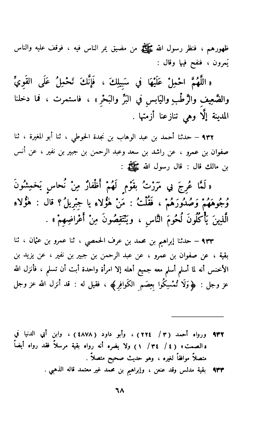 932 - حَدَّثَنَا أَحْمَدُ بْنُ عَبْدِ الْوَهَّابِ بْنِ نَجْدَةَ الْحَوْطِيُّ، ثَنَا أَبُو الْمُغِيرَةِ، ثَنَا صَفْوَانُ بْنُ عَمْرٍو، عَنْ رَاشِدِ بْنِ سَعْدٍ، وَعَبْدِ الرَّحْمَنِ بْنِ جُبَيْرِ بْنِ نُفَيْرٍ، عَنْ أَنَسِ بْنِ مَالِكٍ، قَالَ: قَالَ رَسُولُ اللَّهِ صَلَّى اللهُ عَلَيْهِ وَسَلَّمَ: §" لَمَّا عُرِجَ بِي مَرَرْتُ بِقَوْمٍ لَهُمْ أَظْفَارٌ مِنْ نُحَاسِ يَخْمِشُونَ وجُوهَهُمْ وَصُدُورَهُمْ , فَقُلْتُ مَنْ هَؤُلَاءِ يَا جِبْرِيلُ , قَالَ: هَؤُلَاءِ الَّذِينَ يَأْكُلُونَ لُحُومَ النَّاسِ وَيَنْتَقِصُونَ مِنْ أَعْرَاضِهِمْ "