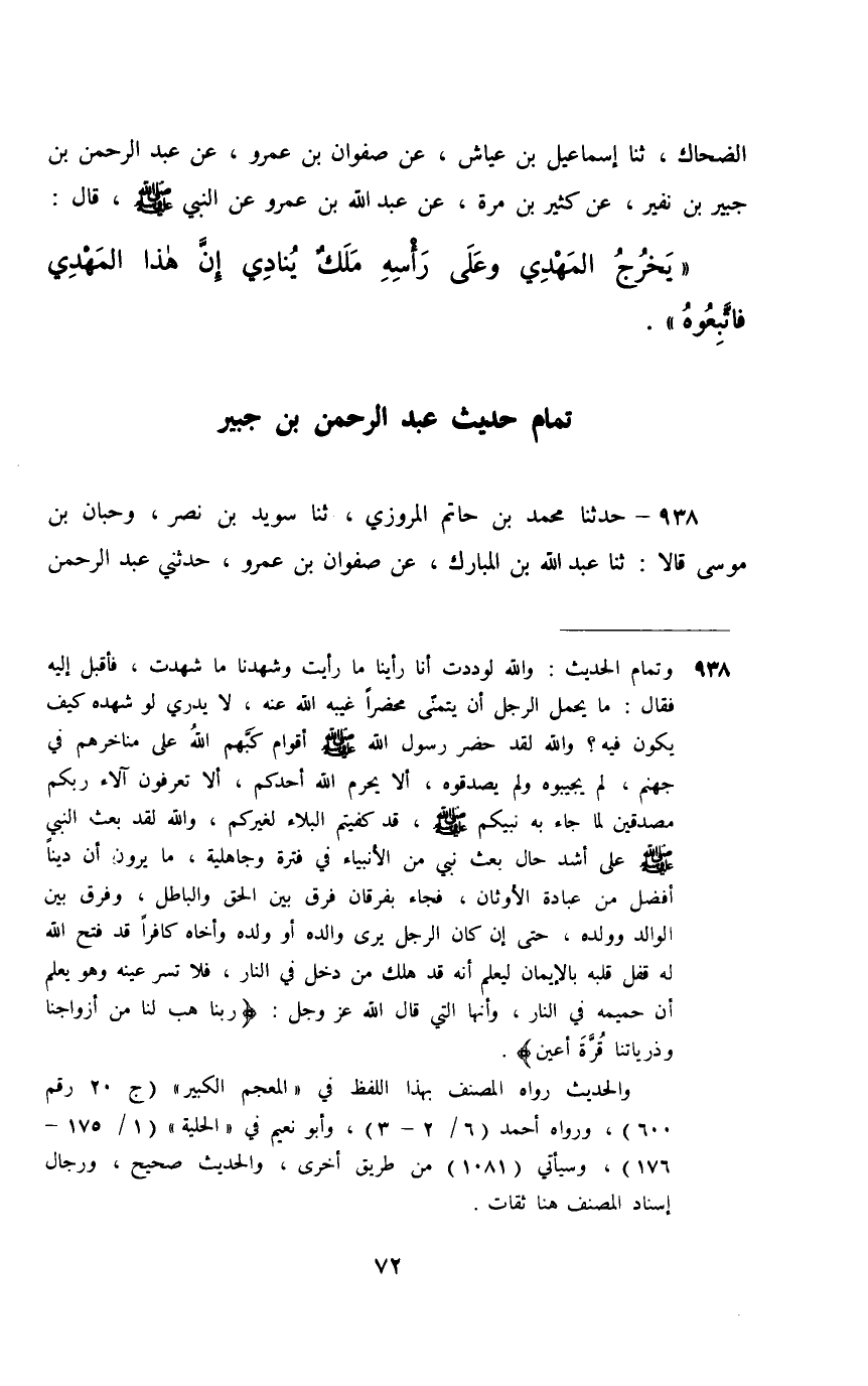 938 - حَدَّثَنَا مُحَمَّدُ بْنُ حَاتِمٍ الْمَرْوَزِيُّ، ثَنَا سُوَيْدُ بْنُ نَصْرٍ، وَحِبَّانُ بْنُ مُوسَى، قَالَا: ثَنَا عَبْدُ اللَّهِ بْنُ الْمُبَارَكِ، عَنْ صَفْوَانَ بْنِ عَمْرٍو، حَدَّثَنِي عَبْدُ الرَّحْمَنِ بْنُ جُبَيْرٍ، عَنْ أَبِيهِ، قَالَ: جَلَسْنَا إِلَى الْمِقْدَادِ يَوْمًا , فَمَرَّ بِهِ رَجُلٌ فَقَالَ: §«طُوبَى لِهَاتَيْنِ الْعَيْنَيْنِ اللَّتَيْنِ رَأَتَا رَسُولَ اللَّهِ صَلَّى اللهُ عَلَيْهِ وَسَلَّمَ» , فَذَكَرَ الْحَدِيثَ