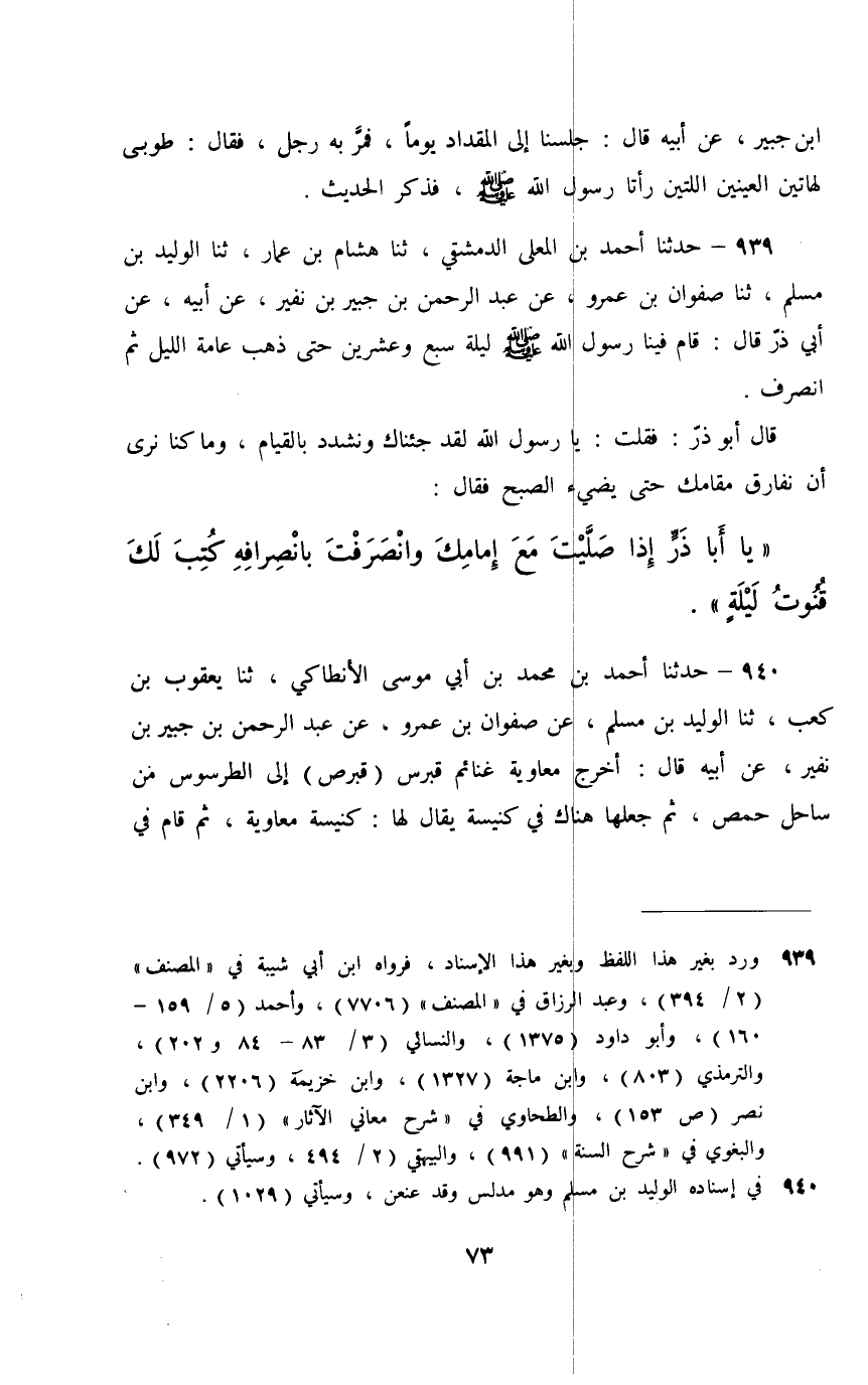 939 - حَدَّثَنَا أَحْمَدُ بْنُ الْمُعَلَّى الدِّمَشْقِيُّ، ثَنَا هِشَامُ بْنُ عَمَّارٍ، ثَنَا الْوَلِيدُ بْنُ مُسْلِمٍ، ثَنَا صَفْوَانُ بْنُ عَمْرٍو، عَنْ عَبْدِ الرَّحْمَنِ بْنِ جُبَيْرِ بْنِ نُفَيْرٍ، عَنْ أَبِيهِ، عَنْ أَبِي ذَرٍّ، قَالَ: قَامَ فِينَا رَسُولُ اللَّهِ صَلَّى اللهُ عَلَيْهِ وَسَلَّمَ لَيْلَةَ سَبْعٍ وَعِشْرِينَ حَتَّى ذَهَبَ عَامَّةُ اللَّيْلِ , ثُمَّ انْصَرَفَ , قَالَ أَبُو ذَرٍّ: فَقُلْتُ: يَا رَسُولَ اللَّهِ لَقَدْ جِئْنَاكَ وَنَشْدُدُ بِالْقِيَامِ , وَمَا كُنَّا نَرَى أَنْ نُفَارِقَ مَقَامَكَ حَتَّى يُضِيءَ الصُّبْحُ , فَقَالَ: «يَا أَبَا ذَرٍّ، §» إِذَا صَلَّيْتَ مَعَ إِمَامِكَ وَانْصَرَفْتَ بِانْصِرَافِهِ كُتِبَ لَكَ قُنُوتُ لَيْلَةٍ "