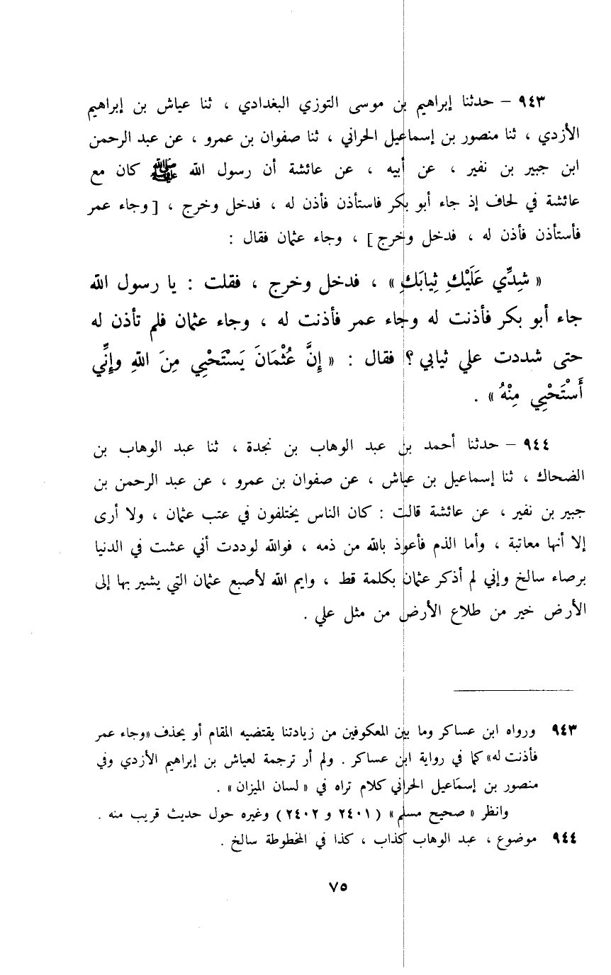 943 - حَدَّثَنَا إِبْرَاهِيمُ بْنُ مُوسَى التَّوَّزِيُّ الْبَغْدَادِيُّ، ثَنَا عَيَّاشُ بْنُ إِبْرَاهِيمَ الْأَزْدِيُّ، ثَنَا مَنْصُورُ بْنُ إِسْمَاعِيلَ الْحَرَّانِيُّ، ثَنَا صَفْوَانُ بْنُ عَمْرٍو، عَنْ عَبْدِ الرَّحْمَنِ بْنِ جُبَيْرِ بْنِ نُفَيْرٍ، عَنْ أَبِيهِ، عَنْ عَائِشَةَ، أَنَّ رَسُولَ اللَّهِ صَلَّى اللهُ عَلَيْهِ وَسَلَّمَ كَانَ مَعَ عَائِشَةَ فِي لِحَافٍ إِذْ جَاءَ أَبُو بَكْرٍ فَاسْتَأْذَنَ فَأَذِنَ لَهُ فَدَخَلَ وَخَرَجَ , [وَجَاءَ عُمَرُ فَأَسْتَأْذَنَ فَأَذِنَ لَهُ فَدَخَلَ وَخَرَجَ] , وَجَاءَ عُثْمَانُ فَقَالَ: «شُدِّي عَلَيْكِ ثِيَابَكِ» فَدَخَلَ وَخَرَجَ , فَقُلْتُ: يَا رَسُولَ اللَّهِ جَاءَ أَبُو بَكْرٍ فَأَذِنْتَ لَهُ , وَجَاءَ عُمَرُ فَأَذِنْتَ لَهُ , وَجَاءَ عُثْمَانُ فَلَمْ تَأْذَنْ لَهُ حَتَّى شَدَدْتُ عَلَيَّ ثِيَابِي فَقَالَ: «إِنَّ §عُثْمَانَ يَسْتَحِي مِنَ اللَّهِ وَإِنِّي أَسْتَحِي مِنْهُ»