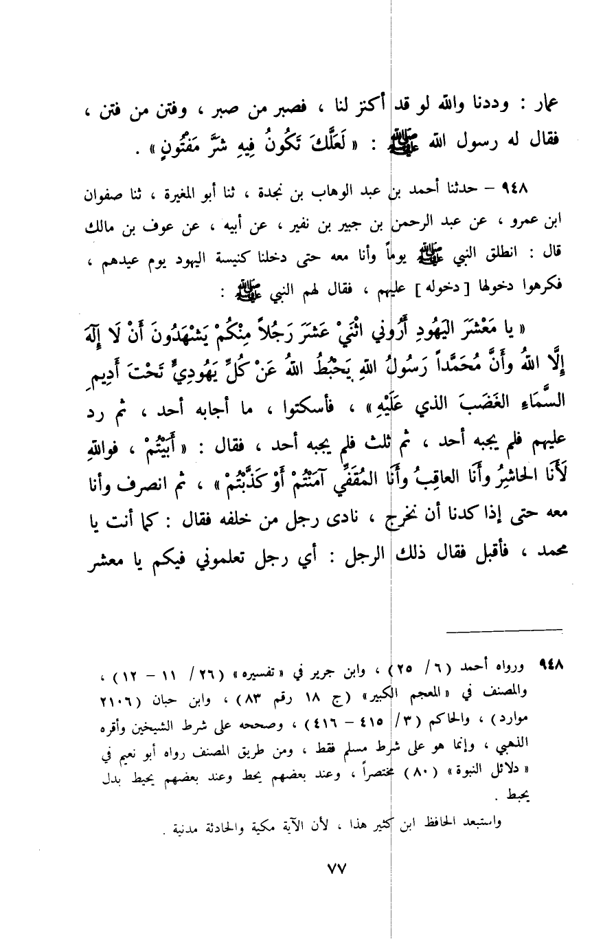 948 - حَدَّثَنَا أَحْمَدُ بْنُ عَبْدِ الْوَهَّابِ بْنِ نَجْدَةَ، ثَنَا أَبُو الْمُغِيرَةِ، ثَنَا صَفْوَانُ بْنُ عَمْرٍو، عَنْ عَبْدِ الرَّحْمَنِ بْنِ جُبَيْرِ بْنِ نُفَيْرٍ، عَنْ أَبِيهِ، عَنْ عَوْفِ بْنِ مَالِكٍ، قَالَ: انْطَلَقَ النَّبِيُّ صَلَّى اللهُ عَلَيْهِ وَسَلَّمَ يَوْمًا وَأَنَا مَعَهُ حَتَّى دَخَلْنَا كَنِيسَةَ الْيَهُودِ يَوْمَ عِيدِهِمْ فَكَرِهُوا دُخُولَهُ عَلَيْهِمْ، فَقَالَ لَهُمُ النَّبِيُّ صَلَّى اللهُ عَلَيْهِ وَسَلَّمَ: «يَا مَعْشَرَ الْيَهُودِ §أَرُونِي اثْنَيْ عَشَرَ رَجُلًا مِنْكُمْ يَشْهَدُونَ أَنْ لَا إِلَهَ إِلَّا اللَّهُ وَأَنَّ مُحَمَّدًا رَسُولُ اللَّهِ يُحْبِطُ اللَّهُ عَنْ كُلِّ يَهُودِيٍّ تَحْتَ أَدِيمِ السَّمَاءِ الْغَضَبَ الَّذِي عَلَيْهِ» فَأُسْكِتُوا مَا أَجَابَهُ أَحَدٌ، ثُمَّ رَدَّ عَلَيْهِمْ فَلَمْ يُجِبْهُ أَحَدٌ , ثُمَّ ثَلَّثَ فَلَمْ يُجِبْهُ أَحَدٌ فَقَالَ: أَبَيْتُمْ فَوَاللَّهِ لَأَنَا الْحَاشِرُ وَأَنَا الْعَاقِبُ وَأَنَا الْمُقَفِّي , آمَنْتُمْ أَوْ كَذَّبْتُمْ , ثُمَّ انْصَرَفَ وَأَنَا مَعَهُ حَتَّى إِذَا كِدْنَا أَنْ نَخْرُجَ نَادَى رَجُلٌ مِنْ خَلْفِهِ فَقَالَ: كَمَا أَنْتَ يَا مُحَمَّدُ فَأَقْبَلَ فَقَالَ ذَلِكَ الرَّجُلُ: أَيَّ رَجُلٍ تُعْلِمُونِي فِيكُمْ يَا مَعْشَرَ الْيَهُودِ؟ قَالُوا: وَاللَّهِ مَا نَعْلَمُ فِينَا رَجُلًا كَانَ أَعْلَمَ بِكِتَابِ اللَّهِ وَلَا أَفْقَهَ مِنْكَ وَلَا مِنْ أَبِيكَ قَبْلَكَ وَلَا مِنْ جَدِّكَ قَبْلَ أَبِيكَ , قَالَ: فَإِنِّي أَشْهَدُ لَهُ بِاللَّهِ إِنَّهُ نَبِيُّ اللَّهِ الَّذِي تَجِدُونَ فِي التَّوْرَاةِ , قَالُوا: كَذَبْتَ , ثُمَّ رَدُّوا عَلَيْهِ , وَقَالُوا فِيهِ شَرًّا , فَقَالَ رَسُولُ اللَّهِ صَلَّى اللهُ عَلَيْهِ وَسَلَّمَ: «كَذَبْتُمْ إِنْ [لَنْ] يُقْبَلَ قَوْلُكُمْ» قَالَ: فَخَرَجْنَا وَنَحْنُ ثَلَاثَةٌ: رَسُولُ اللَّهِ صَلَّى اللهُ عَلَيْهِ وَسَلَّمَ وَأَنَا وَابْنُ سَلَّامٍ , وَأَنْزَلَ اللَّهُ عَزَّ وَجَلَّ {قُلْ أَرَأَيْتُمْ إِنْ كَانَ مِنْ عِنْدِ اللَّهِ وَكَفَرْتُمْ بِهِ وَشَهِدَ شَاهِدٌ مِنْ بَنِي إِسْرَائِيلَ عَلَى مِثْلِهِ فَآمَنَ وَاسْتَكْبَرْتُمْ إِنَّ اللَّهَ لَا يَهْدِي الْقَوْمَ الظَّالِمِينَ} [الأحقاف: 10]