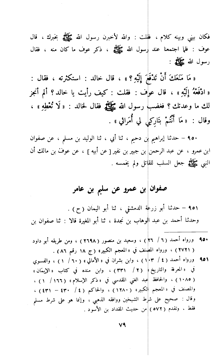 950 - حَدَّثَنَا إِبْرَاهِيمُ بْنُ دُحَيْمٍ، ثَنَا أَبِي، ثَنَا الْوَلِيدُ بْنُ مُسْلِمٍ، عَنْ صَفْوَانَ بْنِ عَمْرٍو، عَنْ عَبْدِ الرَّحْمَنِ بْنِ جُبَيْرِ بْنِ نُفَيْرٍ، [عَنْ أَبِيهِ] ، عَنْ عَوْفِ بْنِ مَالِكٍ، أَنَّ النَّبِيَّ صَلَّى اللهُ عَلَيْهِ وَسَلَّمَ §جَعَلَ السَّلَبَ لِلْقَاتِلِ وَلَمْ يُخَمِّسْهُ