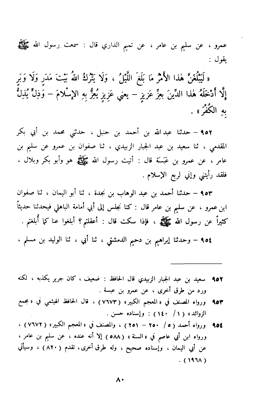 952 - حَدَّثَنَا عَبْدُ اللَّهِ بْنُ أَحْمَدَ بْنِ حَنْبَلٍ، حَدَّثَنِي مُحَمَّدُ بْنُ أَبِي بَكْرٍ الْمُقَدَّمِيُّ، ثَنَا سَعِيدُ بْنُ عَبْدِ الْجَبَّارِ الزُّبَيْدِيُّ، ثَنَا صَفْوَانُ بْنُ عَمْرٍو، عَنْ سُلَيْمِ بْنِ عَامِرٍ، عَنْ عَمْرِو بْنِ عَبَسَةَ، قَالَ: §«أَتَيْتُ رَسُولَ اللَّهِ صَلَّى اللهُ عَلَيْهِ وَسَلَّمَ , هُوَ وَأَبُو بَكْرٍ وَبِلَالٌ , فَلَقَدْ رَأَيْتُنِي وَإِنِّي لَرُبُعُ الْإِسْلَامِ»