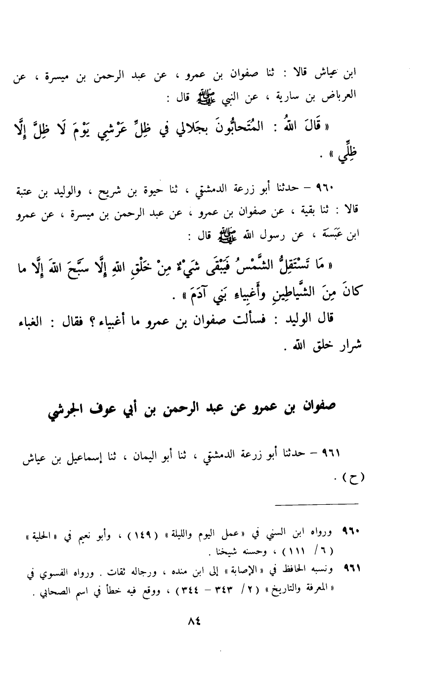 960 - حَدَّثَنَا أَبُو زُرْعَةَ الدِّمَشْقِيُّ، ثَنَا حَيْوَةُ بْنُ شُرَيْحٍ، وَالْوَلِيدُ بْنُ عُتْبَةَ، قَالَا: ثَنَا بَقِيَّةُ، عَنْ صَفْوَانَ بْنِ عَمْرٍو، عَنْ عَبْدِ الرَّحْمَنِ بْنِ مَيْسَرَةَ، عَنْ عَمْرِو بْنِ عَبَسَةَ، عَنْ رَسُولِ اللَّهِ صَلَّى اللهُ عَلَيْهِ وَسَلَّمَ قَالَ: §«مَا تَسْتَقِلُّ الشَّمْسُ فَيَبْقَى شَيْءٌ مِنْ خَلْقِ اللَّهِ إِلَّا سَبَّحَ اللَّهَ إِلَّا مَا كَانَ مِنَ الشَّيَاطِينِ وَأَغْبِيَاءِ بَنَى آدَمَ» قَالَ الْوَلِيدُ: فَسَأَلْتُ صَفْوَانَ بْنَ عَمْرٍو: مَا أَغْبِيَاءُ؟ فَقَالَ: الْغَبَاءُ: شِرَارُ خَلْقِ اللَّهِ