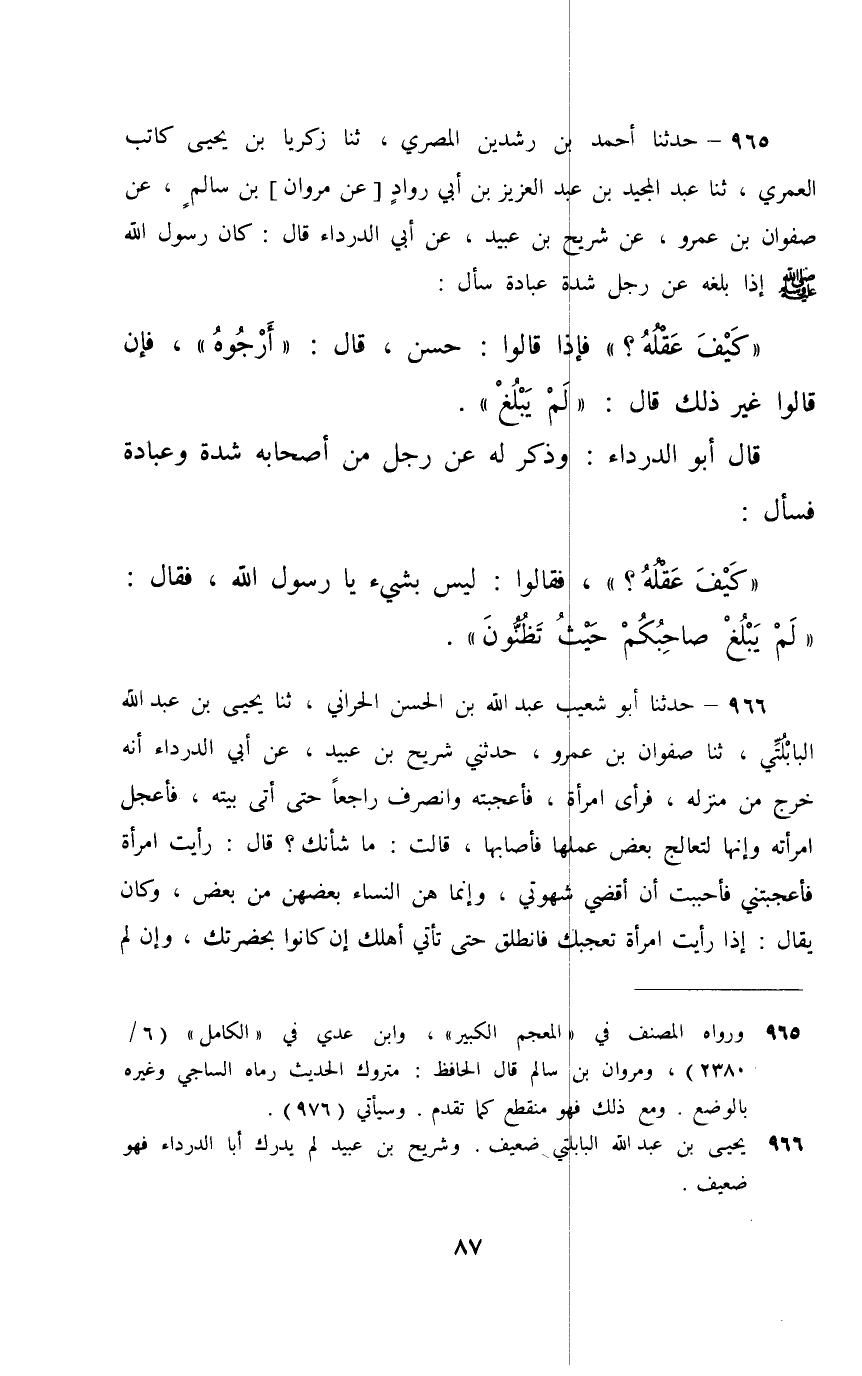 965 - حَدَّثَنَا أَحْمَدُ بْنُ رِشْدِينَ الْمِصْرِيُّ، ثَنَا زَكَرِيَّا بْنُ يَحْيَى، كَاتِبُ الْعُمَرِيِّ , ثَنَا عَبْدُ الْمَجِيدِ بْنُ عَبْدِ الْعَزِيزِ بْنِ أَبِي رَوَّادَ، [عَنْ مَرْوَانَ] بْنِ سَالِمٍ، عَنْ صَفْوَانَ بْنِ عَمْرٍو، عَنْ شُرَيْحِ بْنِ عُبَيْدٍ، عَنْ أَبِي الدَّرْدَاءِ، قَالَ: كَانَ رَسُولُ اللَّهِ صَلَّى اللهُ عَلَيْهِ وَسَلَّمَ §إِذَا بَلَغَهُ عَنْ رَجُلٍ شِدَّةُ عِبَادَةٍ سَأَلَ: «كَيْفَ عَقْلُهُ؟» فَإِذَا قَالُوا حَسَنٌ قَالَ: «أَرْجُوهُ» فَإِنْ قَالُوا غَيْرَ ذَلِكَ قَالَ: «لَمْ يَبْلُغْ» قَالَ أَبُو الدَّرْدَاءِ: وَذُكِرَ لَهُ عَنْ رَجُلٍ مِنْ أَصْحَابِهِ شِدَّةٌ وَعِبَادَةٌ , فَسَأَلَ: «كَيْفَ عَقْلُهُ؟» فَقَالُوا: لَيْسَ بِشَيْءٍ يَا رَسُولَ اللَّهِ , فَقَالَ: «لَمْ يَبْلُغْ صَاحِبُكُمْ حَيْثُ تَظُنُّونَ»