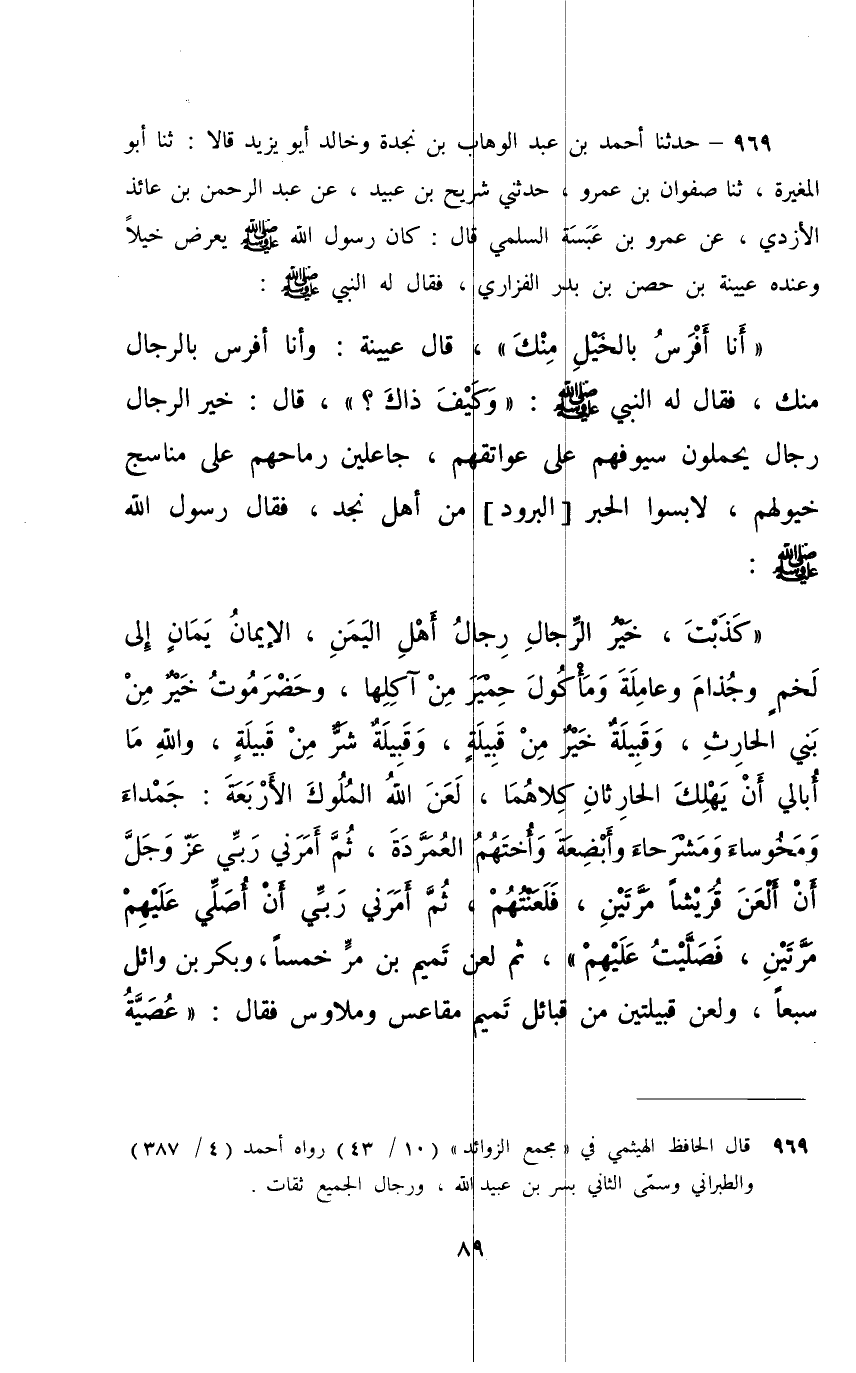 969 - حَدَّثَنَا أَحْمَدُ بْنُ عَبْدِ الْوَهَّابِ بْنِ نَجْدَةَ، وَخَالِدٌ أَبُو يَزِيدَ، قَالَا: ثَنَا أَبُو الْمُغِيرَةِ، ثَنَا صَفْوَانُ بْنُ عَمْرٍو، حَدَّثَنِي شُرَيْحُ بْنُ عُبَيْدٍ، عَنْ عَبْدِ الرَّحْمَنِ بْنِ عَائِذٍ الْأَزْدِيِّ، عَنْ عَمْرِو بْنِ عَبَسَةَ السُّلَمِيِّ، قَالَ: كَانَ رَسُولُ اللَّهِ صَلَّى اللهُ عَلَيْهِ وَسَلَّمَ يَعْرِضُ خَيْلًا وَعِنْدَهُ عُيَيْنَةُ بْنُ حِصْنِ بْنِ بَدْرٍ الْفَزَارِيُّ فَقَالَ لَهُ النَّبِيُّ صَلَّى اللهُ عَلَيْهِ وَسَلَّمَ: «أَنَا أَفْرَسُ بِالْخَيْلِ مِنْكَ» قَالَ عُيَيْنَةُ: وَأَنَا أَفْرَسُ بِالرِّجَالِ مِنْكَ، فَقَالَ لَهُ النَّبِيُّ صَلَّى اللهُ عَلَيْهِ وَسَلَّمَ: «وَكَيْفَ ذَاكَ؟» قَالَ: خَيْرُ الرِّجَالِ رِجَالٌ يَحْمِلُونَ سُيُوفَهُمْ عَلَى عَوَاتِقِهِمْ , جَاعِلِينَ رِمَاحَهُمْ عَلَى مَنَاسِجِ خُيُولِهِمْ، لَابِسُوا الْحُبْرَ [الْبُرُودَ] مِنْ أَهْلِ نَجْدٍ، فَقَالَ رَسُولُ اللَّهِ صَلَّى اللهُ عَلَيْهِ وَسَلَّمَ: «كَذَبْتَ , §خَيْرُ الرِّجَالِ رِجَالُ أَهْلِ الْيَمَنِ , الْإِيمَانُ يَمَانٍ إِلَى لَخْمٍ وَجُذَامَ وَعَامِلَةَ وَمَأْكُولِ حِمْيَرَ مِنْ آكِلِهَا , وَحَضْرَمُوتُ خَيْرٌ مِنْ بَنِي الْحَارِثِ , وَقَبِيلَةٌ خَيْرٌ مِنْ قَبِيلَةٍ , وَقَبِيلَةٌ شَرٌّ مِنْ قَبِيلَةٍ , وَاللَّهِ مَا أُبَالِي أَنْ يَهْلِكَ الْحَارِثَانِ كِلَاهُمَا. لَعَنَ اللَّهُ الْمُلُوكَ الْأَرْبَعَةَ جَمْدَاءَ وَمَخْوَسَاءَ وَمَشْرَحَاءَ وَأَبْضِعَةَ وَأُخْتَهُمُ الْعَمَرَّدَةَ , ثُمَّ أَمَرَنِي رَبِّي عَزَّ وَجَلَّ أَنْ أَلْعَنَ قُرَيْشًا مَرَّتَيْنِ , فَلَعَنْتُهُمْ , ثُمَّ أَمَرَنِي رَبِّي أَنْ أُصَلِّيَ عَلَيْهِمْ مَرَّتَيْنِ , فَصَلَّيْتُ عَلَيْهِمْ» ثُمَّ لَعَنَ تَمِيمَ بْنَ مُرٍّ خَمْسًا , وَبَكْرَ بْنَ وَائِلٍ سَبْعًا , وَلَعَنَ قَبِيلَتَيْنِ مِنْ قَبَائِلِ تَمِيمٍ مُقَاعِسَ وَمَلَاوِسَ فَقَالَ: «عُصَيَّةُ عَصَتِ اللَّهَ وَرَسُولَهُ» ثُمَّ قَالَ: لَأَسْلَمُ وَغِفَارٌ وَمُزَيْنَةُ وَأَخْلَاطُهُمْ مِنْ جُهَيْنَةَ خَيْرٌ مِنْ بَنِي أَسَدٍ وَتَمِيمٍ وَغَطَفَانَ وَهَوَازِنَ عِنْدَ اللَّهِ يَوْمَ الْقِيَامَةِ " ثُمَّ قَالَ: " شَرُّ قَبِيلَةٍ فِي الْعَرَبِ نَجْرَانُ وَبَنُو تَغْلِبَ , وَأَكْثَرُ الْقَبَائِلِ فِي الْجَنَّةِ مَذْحِجٌ [وَمَأْكُولٌ]