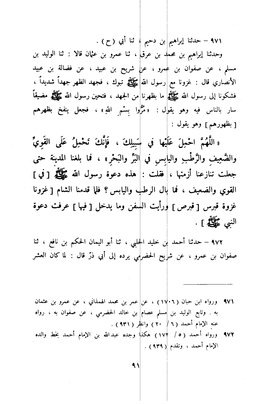 971 - حَدَّثَنَا إِبْرَاهِيمُ بْنُ دُحَيْمٍ، ثَنَا أَبِي، حَ، وَحَدَّثَنَا إِبْرَاهِيمُ بْنُ مُحَمَّدِ بْنِ عِرْقٍ، ثَنَا عَمْرُو بْنُ عُثْمَانَ، قَالَا: ثَنَا الْوَلِيدُ بْنُ مُسْلِمٍ، عَنْ صَفْوَانَ بْنِ عَمْرٍو، عَنْ شُرَيْحِ بْنِ عُبَيْدٍ، عَنْ فَضَالَةَ بْنِ عُبَيْدٍ الْأَنْصَارِيِّ، قَالَ: غَزَوْنَا مَعَ رَسُولِ اللَّهِ صَلَّى اللهُ عَلَيْهِ وَسَلَّمَ تَبُوكَ , فَجَهَدَ الظَّهْرُ جَهْدًا شَدِيدًا , فَشَكَوْنَا إِلَى رَسُولِ اللَّهِ صَلَّى اللهُ عَلَيْهِ وَسَلَّمَ مَا بِظَهْرِنَا مِنَ الْجَهْدِ , فَتَحَيَّنَ رَسُولُ اللَّهِ صَلَّى اللهُ عَلَيْهِ وَسَلَّمَ مَضِيقًا سَارَ بِالنَّاسِ فِيهِ وَهُوَ يَقُولُ: «مُرُّوا بِسْمِ اللَّهِ» فَجَعَلَ يَنْفُخُ بِظَهْرِهِمْ [بِظُهُورِهِمْ] وَهُوَ يَقُولُ: §«اللَّهُمَّ احْمِلْ عَلَيْهَا فِي سَبِيلِكَ , فَإِنَّكَ تَحْمِلُ عَلَى الْقَوِيِّ وَالضَّعِيفِ , وَالرَّطْبِ وَالْيَابِسِ , فِي الْبَرِّ وَالْبَحْرِ» , فَمَا بَلَغْنَا الْمَدِينَةَ حَتَّى جَعَلَتْ تُنَازِعُنَا أَزِمَّتَهَا , فَقُلْتُ هَذِهِ دَعْوَةُ رَسُولِ اللَّهِ صَلَّى اللهُ عَلَيْهِ وَسَلَّمَ [فِي] الْقَوِيِّ وَالضَّعِيفِ , فَمَا بَالُ الرَّطْبِ وَالْيَابِسِ؟ فَلَمَّا قَدِمْنَا الشَّامَ غَزَوْنَا غَزْوَةَ قُبْرُسَ قُبْرُصَ وَرَأَيْتُ السُّفُنَ وَمَا يَدْخُلُ [فِيهَا] عَرَفْتُ دَعْوَةَ النَّبِيِّ صَلَّى اللهُ عَلَيْهِ وَسَلَّمَ
