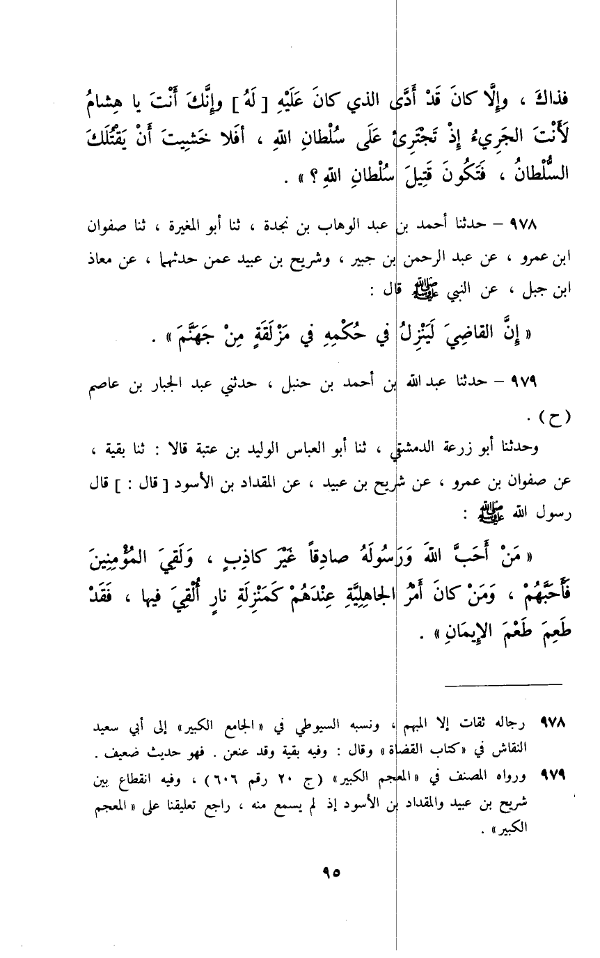 979 - حَدَّثَنَا عَبْدُ اللَّهِ بْنُ أَحْمَدَ بْنِ حَنْبَلٍ، حَدَّثَنِي عَبْدُ الْجَبَّارِ بْنُ عَاصِمٍ، حَ وَحَدَّثَنَا أَبُو زُرْعَةَ الدِّمَشْقِيُّ، ثَنَا أَبُو الْعَبَّاسِ الْوَلِيدُ بْنُ عُتْبَةَ قَالَا، ثَنَا بَقِيَّةُ، عَنْ صَفْوَانَ بْنِ عَمْرٍو، عَنْ شُرَيْحِ بْنِ عُبَيْدٍ، عَنِ الْمِقْدَادِ بْنِ الْأَسْوَدِ، [قَالَ] : قَالَ رَسُولُ اللَّهِ صَلَّى اللهُ عَلَيْهِ وَسَلَّمَ: §«مَنْ أَحَبَّ اللَّهَ وَرَسُولَهُ صَادِقًا غَيْرَ كَاذِبٍ , وَلَقِيَ الْمُؤْمِنِينَ فَأَحَبَّهُمْ , وَمَنْ كَانَ أَمْرُ الْجَاهِلِيَّةِ عِنْدَهُمْ كَمَنْزِلَةِ نَارٍ أُلْقِيَ فِيهَا؛ فَقَدْ طَعِمَ طَعْمَ الْإِيمَانِ»
