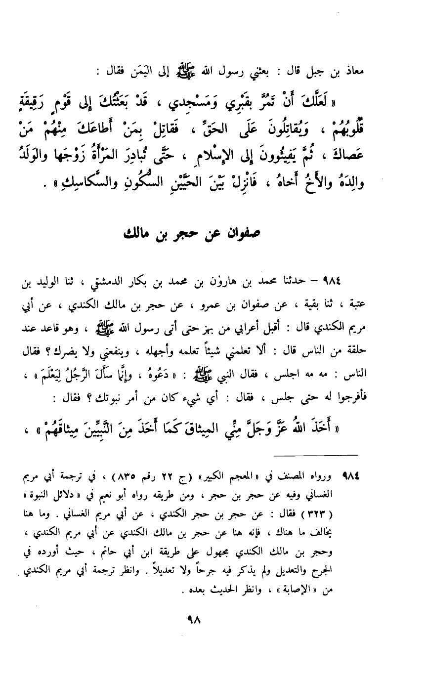 984 - حَدَّثَنَا مُحَمَّدُ بْنُ هَارُونَ بْنِ مُحَمَّدِ بْنِ بَكَّارٍ الدِّمَشْقِيُّ، ثَنَا الْوَلِيدُ بْنُ عُتْبَةَ، ثَنَا بَقِيَّةُ، عَنْ صَفْوَانَ بْنِ عَمْرٍو، عَنْ حُجْرِ بْنِ مَالِكٍ الْكِنْدِيِّ، عَنْ أَبِي مَرْيَمَ الْكِنْدِيِّ، قَالَ: أَقْبَلَ أَعْرَابِيُّ مِنْ بَهْزٍ حَتَّى أَتَى رَسُولَ اللَّهِ صَلَّى اللهُ عَلَيْهِ وَسَلَّمَ وَهُوَ قَاعِدٌ عِنْدَ حَلْقَةٍ مِنَ النَّاسِ قَالَ: أَلَا تُعَلِّمَنِي شَيْئًا تَعْلَمُهُ وَأَجْهَلُهُ , وَيَنْفَعُنِي وَلَا يَضُرُّكَ؟ فَقَالَ النَّاسُ: مَهْ مَهْ , اجْلِسْ , فَقَالَ النَّبِيُّ صَلَّى اللهُ عَلَيْهِ وَسَلَّمَ: «دَعُوهُ وَإِنَّمَا سَأَلَ الرَّجُلُ لِيَعْلَمَ» , فَأَفْرَجُوا لَهُ حَتَّى جَلَسَ , فَقَالَ: أَيُّ شَيْءٍ كَانَ مِنْ أَمْرِ نُبُوَّتِكَ؟ فَقَالَ: §" أَخَذَ اللَّهُ عَزَّ وَجَلَّ مِنِّي الْمِيثَاقَ كَمَا أَخَذَ مِنَ النَّبِيِّينَ مِيثَاقَهُمْ , وَتَلَا {وَمِنْكَ وَمَنْ نُوحٍ وَإِبْرَاهِيمَ وَمُوسَى وَعِيسَى ابْنِ مَرْيَمَ وَأَخَذْنَا مِنْهُمْ مِيثَاقًا غَلِيظًا} [الأحزاب: 7] , وَبَشَّرَ بِي الْمَسِيحُ عِيسَى ابْنُ مَرْيَمَ , وَرَأَتْ أُمُّ رَسُولِ اللَّهِ صَلَّى اللهُ عَلَيْهِ وَسَلَّمَ فِي مَنَامِهَا أَنَّهُ خَرَجَ مِنْ بَيْنَ رِجْلَيْهَا سِرَاجٌ أَضَاءَتْ لَهَا مِنْهُ قُصُورُ الشَّامِ " , فَقَالَ الْأَعْرَابِيُّ هَا , وَأَدْنَا رَأْسَهُ مِنْهُ , وَكَانَ فِي سَمْعِهِ شَيْءٌ , فَقَالَ رَسُولُ اللَّهِ صَلَّى اللهُ عَلَيْهِ وَسَلَّمَ: «وَوَرَاءَ ذَلِكَ وَوَرَاءَ ذَلِكَ» , مَرَّتَيْنِ أَوْ ثَلَاثًا