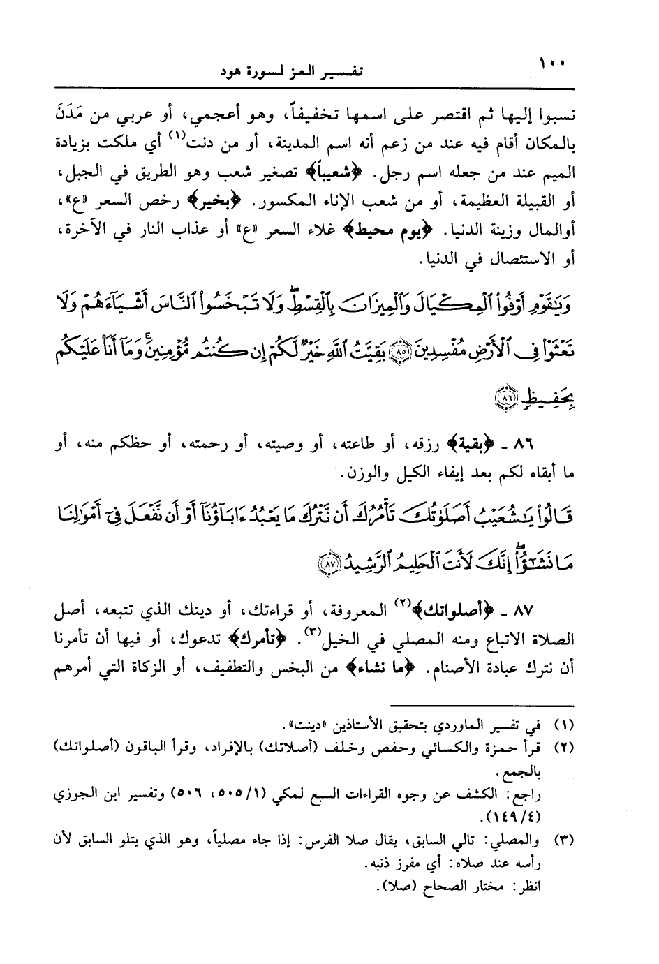 87 - {أصلواتك} المعروفة، أو قراءتك، أو دينك الذي تتبعه، أصل الصلاة الاتباع ومنه المصلي في الخيل. {تَأْمُرُكَ} تدعوك، أو فيها أن تأمرنا أن نترك عبادة الأصنام. {مَا نَشَآءُ} من البخس والتطفيف، أو الزكاة التي أمرهم
