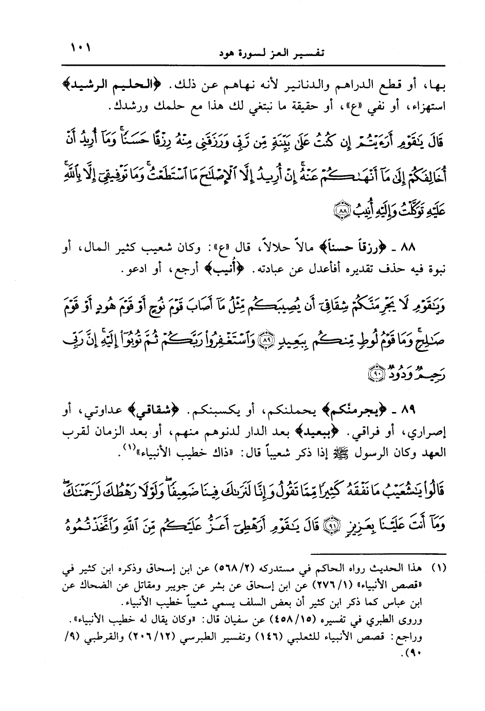 89 - {يَجْرِمَنَّكُمْ} يحملنكم، أو يكسبنكم. {شِقَاقِى} عداوتي، أو إصراري، أو فراقي. {بِبَعيدٍ} بعد الدار لدنوهم منهم، أو بعد الزمان لقرب العهد وكان الرسول [صلى الله عليه وسلم] إذا ذكر شعيباً قال: " ذاك خطيب الأنبياء ". {قالوا يا شعيب ما نفقه كثيراً مما تقول وإنا لنراك فينا ضعيفاً ولولا رهطك لرجمناك وما أنت علينا بعزيز قال يا قوم أرهطى أعز عليكم من الله اتخذتموه