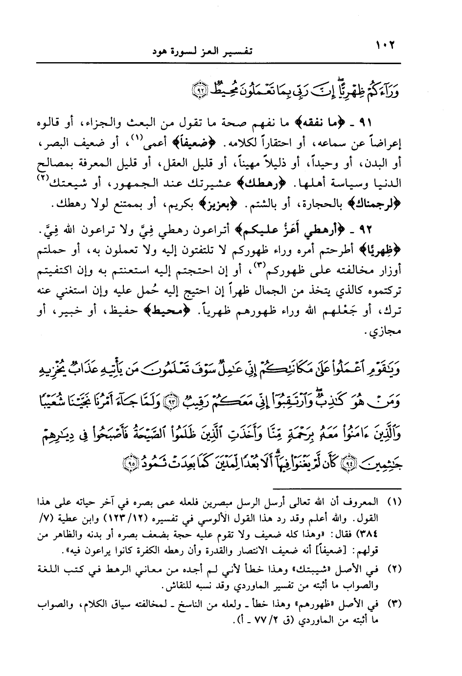 92 - {أَرَهْطِى أَعَزُّ عَلَيْكُم} أتراعون رهطي فِيَّ ولا تراعون الله فِيَّ. {ظِهْرِيّاً} أطرحتم أمره وراء ظهوركم لا تلتفتون إليه ولا تعملون به، أو حملتم أوزار مخالفته على ظهوركم، أو إن احتجتم إليه استعنتم به وإن اكتفيتم تركتموه كالذي يتخذ من الجمال ظهراً إن اُحتيج إليه حُمل عليه وإن استُغني عنه تُرك، أو جَعْلهم الله وراء ظهورهم ظهرياً. {محيط} حفيظ، أو خبير، أو مجازي. {ويا قوم اعملوا على مكانتكم إنى عاملٌ سوف تعلمون من يأتيه عذاب يخزيه ومن هو كاذبٌ وارتقبوا إني معكم رقيبٌ ولما جاء أمرنا نجينا شعيباً والذين ءامنوا معه برحمةٍ منا واخذت الذين ظلموا الصيحة فأصبحوا في ديارهم جاثمين كأن لم يغنوا فيها إلا بعد لمدين كما بعدت ثمود}